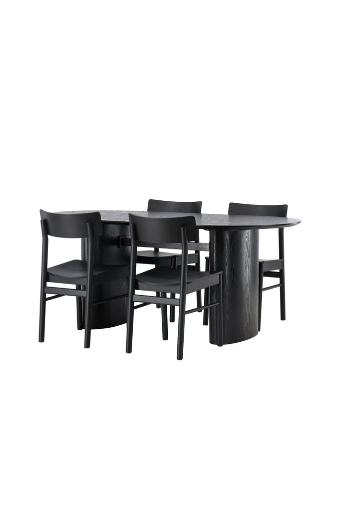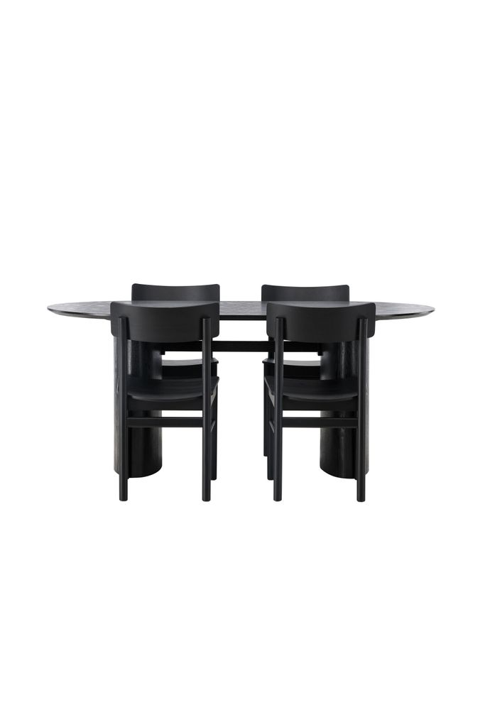 Elegant matgrupp med ovalt bord i svart MDF och stilrena stolar i svart gummiträ. Perfekt för moderna hem.