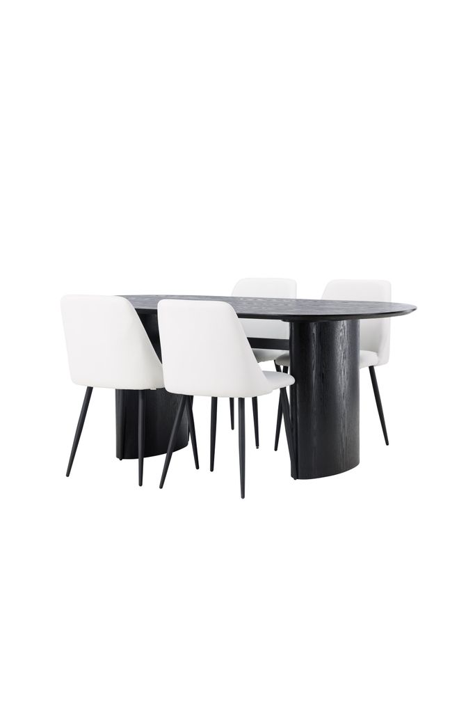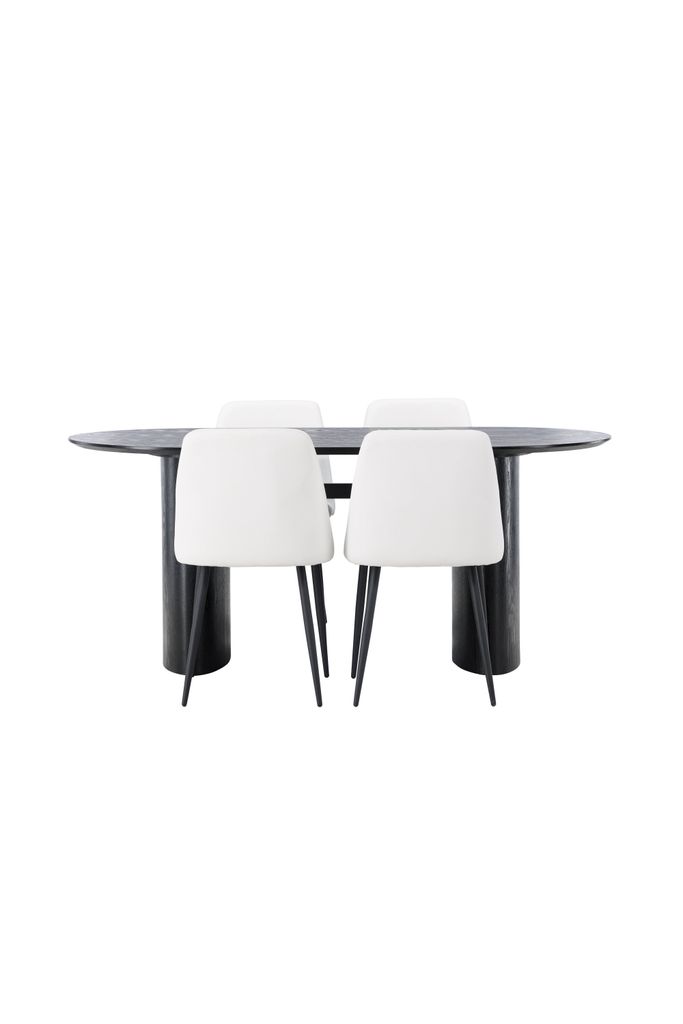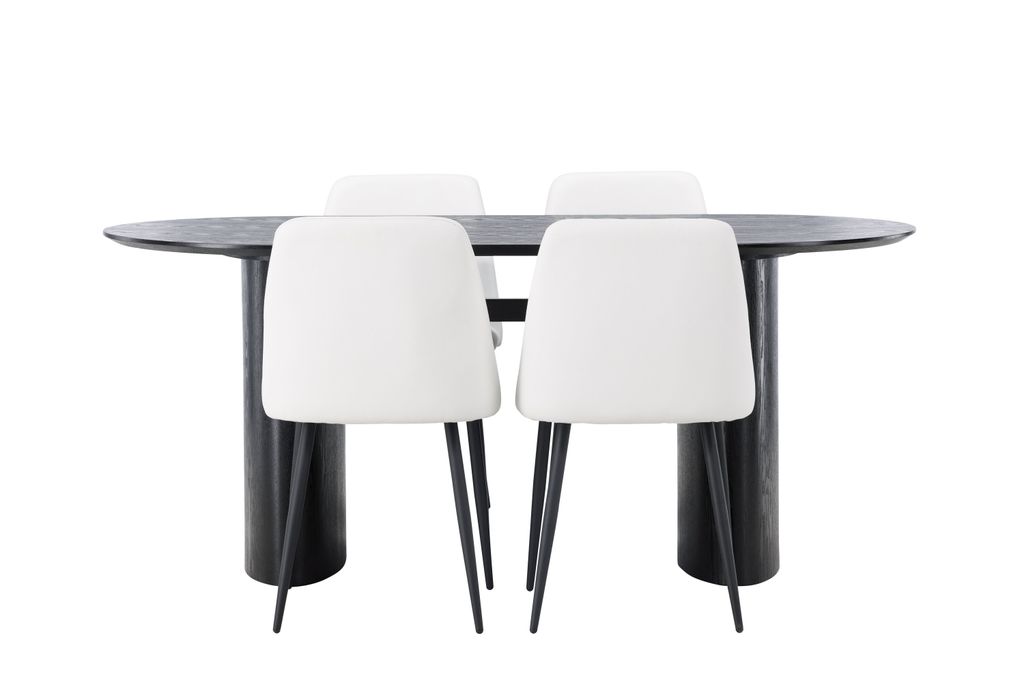 Elegant matgrupp med ovalt bord i svart MDF och vita helklädda stolar i PU med stoppad sits för ultimat komfort.