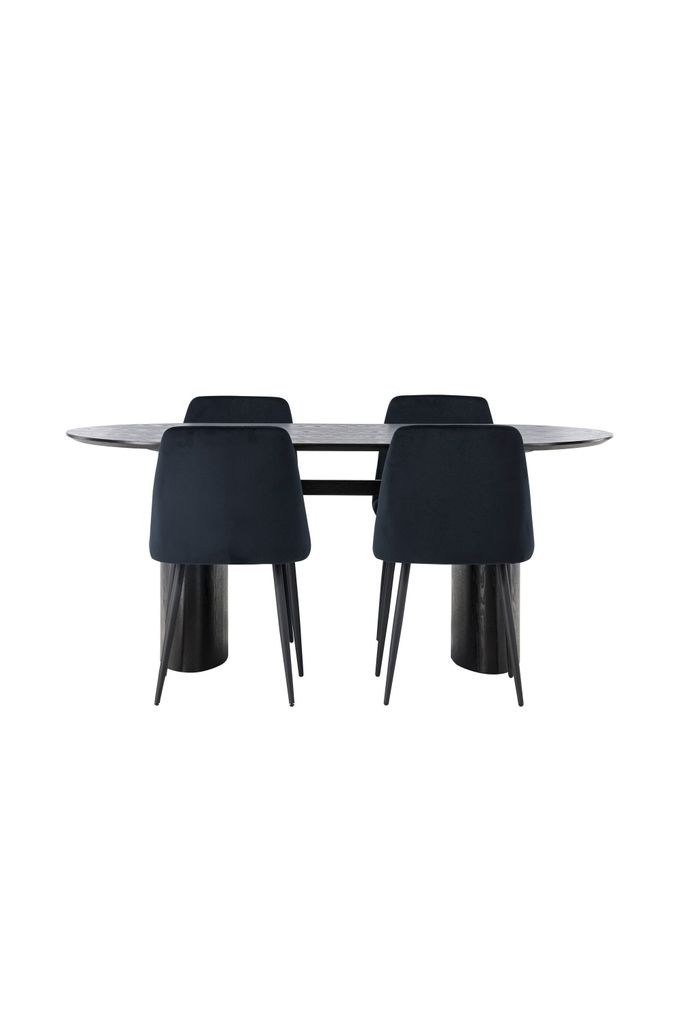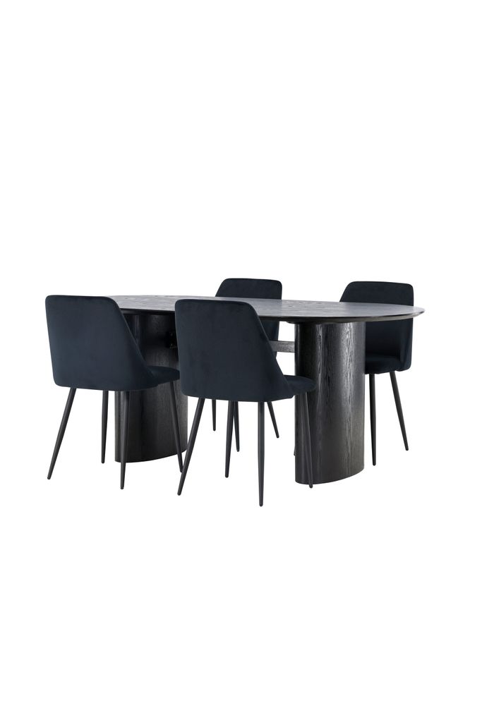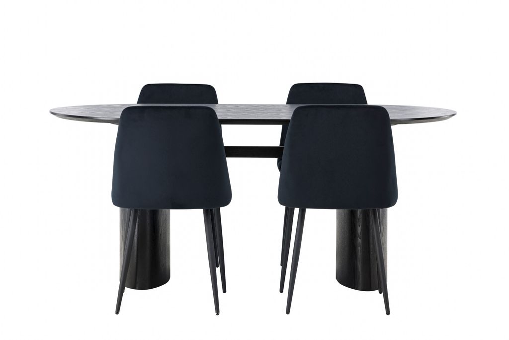 Lyxig matgrupp med ovalt bord i svart MDF och stilrena sammetstolar. Perfekt för moderna hem.