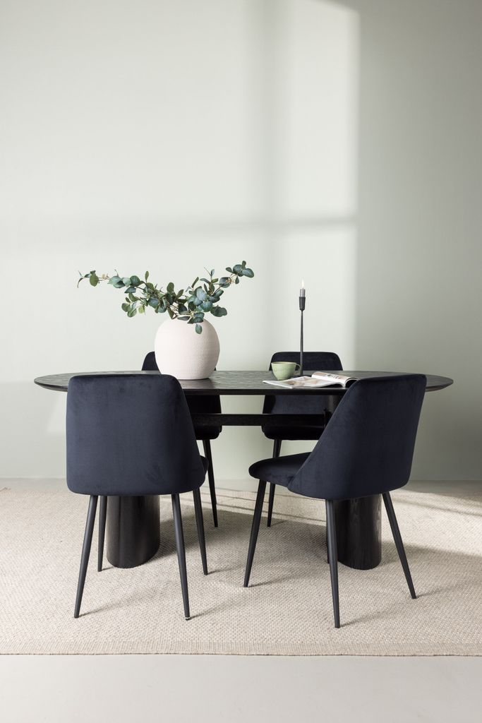 Till denna matgrupp hör de stilrena svarta stolarna från serien Night, med helklädd sits i svart sammetstyg som ger en lyxig känsla. Stolarna har ben i matchande svart kulör, vilket skapar en harmonisk och enhetlig look.