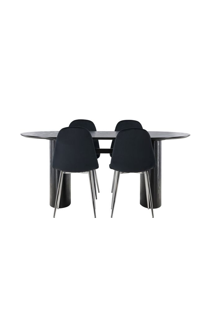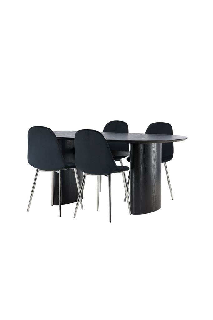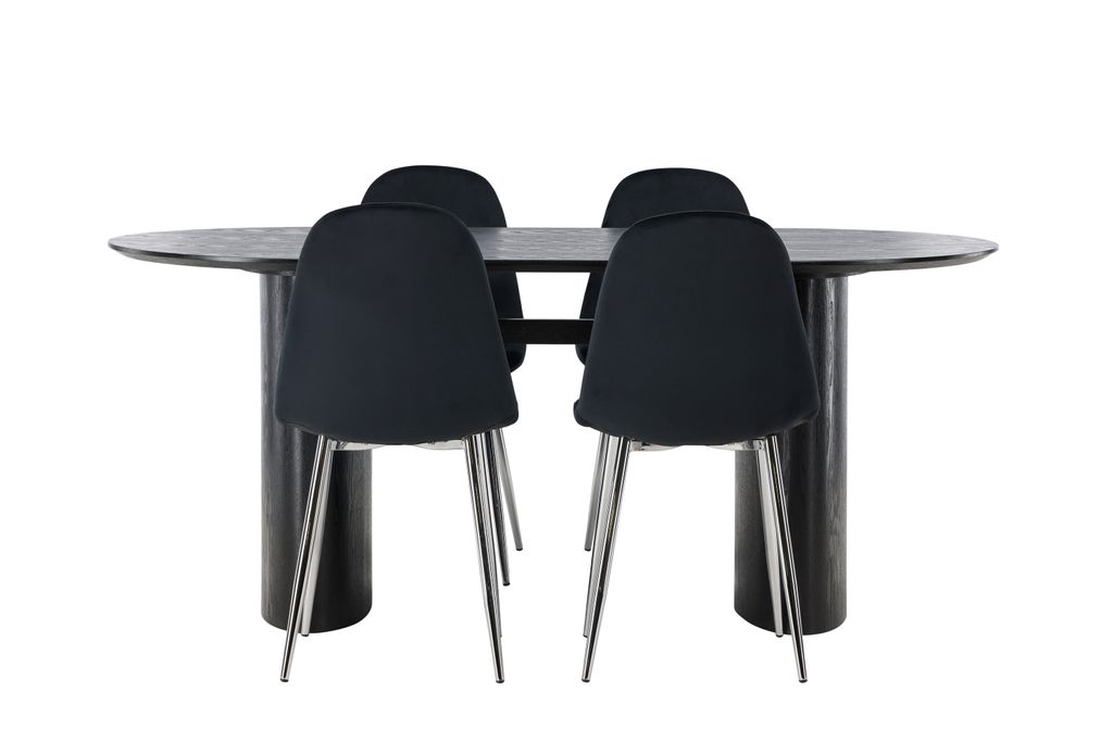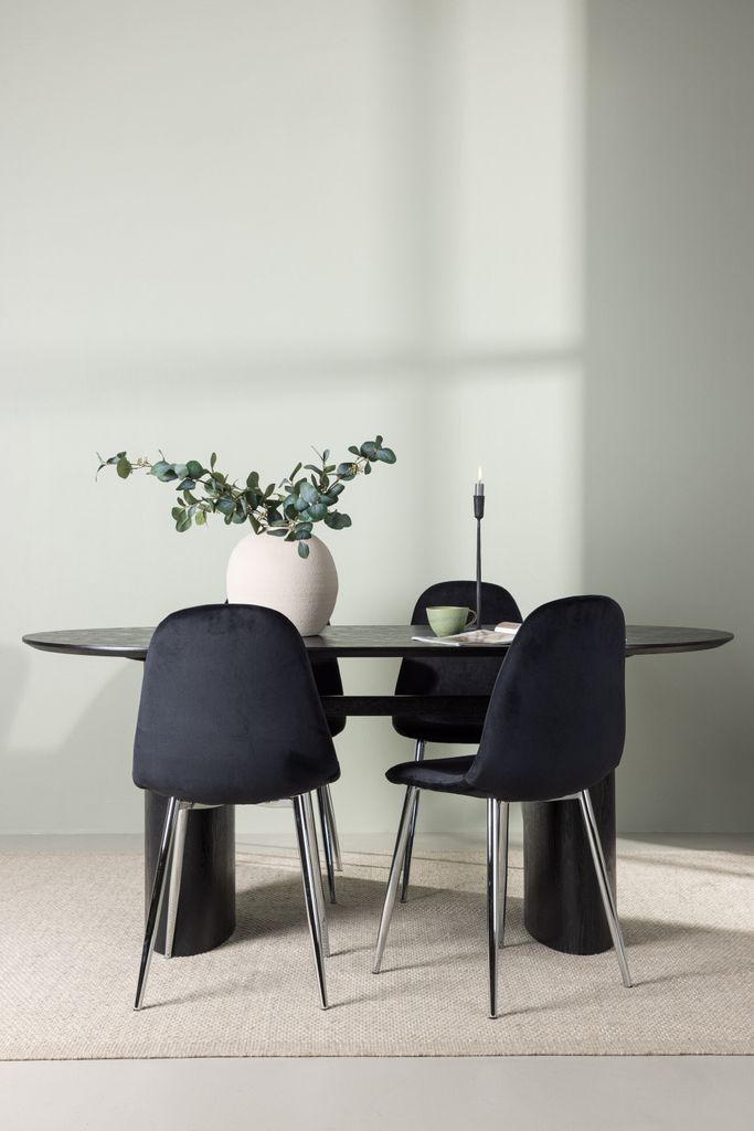 Stilren matgrupp med ovalt bord i svart MDF och eleganta, bekväma stolar i svart sammet och krom.
