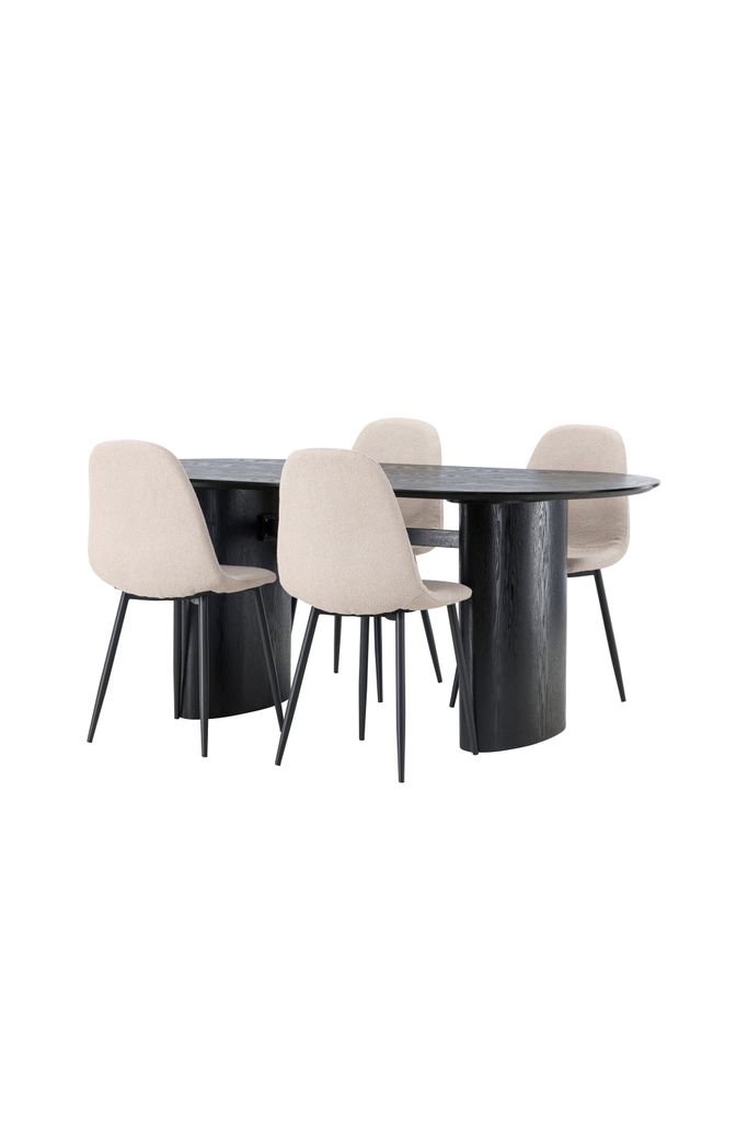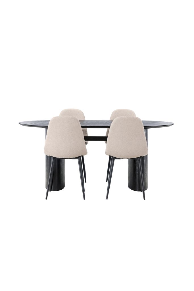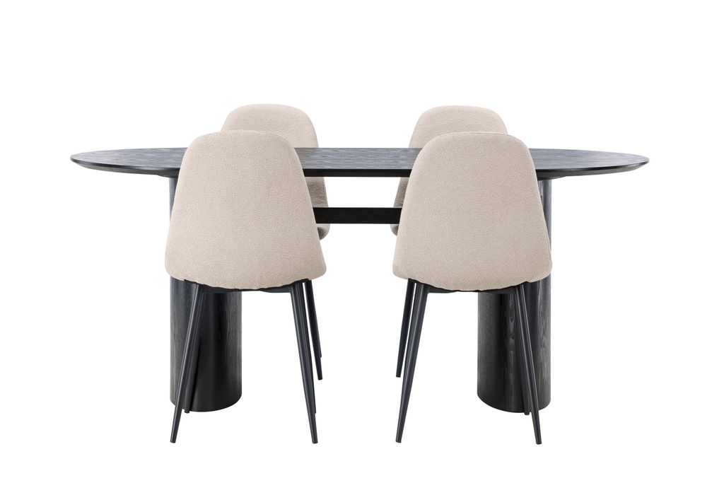 Elegant matgrupp med ovalt svart bord i MDF och bekväma beige stolar i boucletyg. Perfekt för stilmedvetna hem.