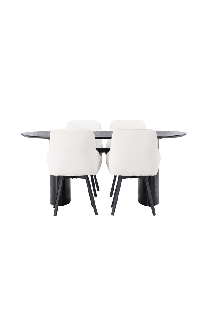 Elegant matgrupp med svart ovalt bord och beige komfortabla stolar. Perfekt för stilfulla middagar.