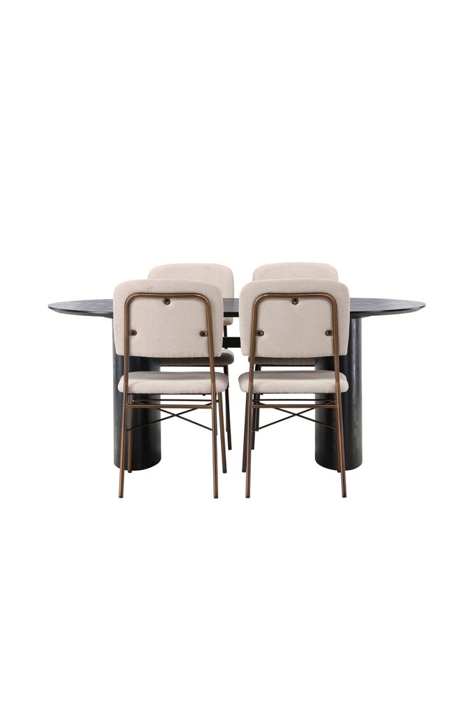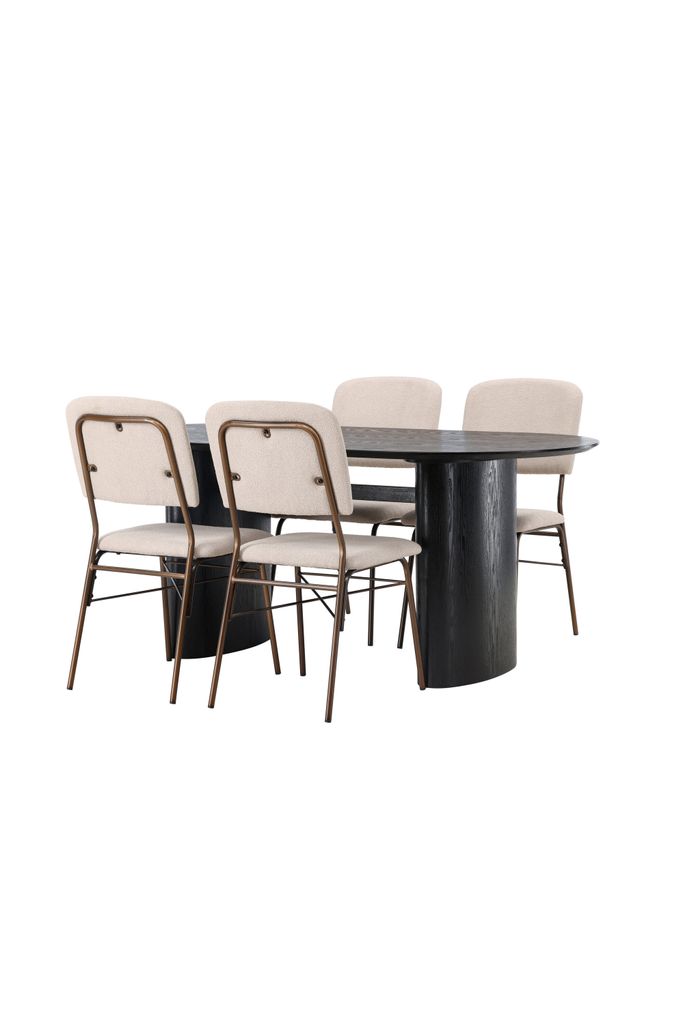 Elegant matgrupp med ovalt bord i svart MDF och stilrena beige stolar i polyestertyg, perfekt för moderna hem.
