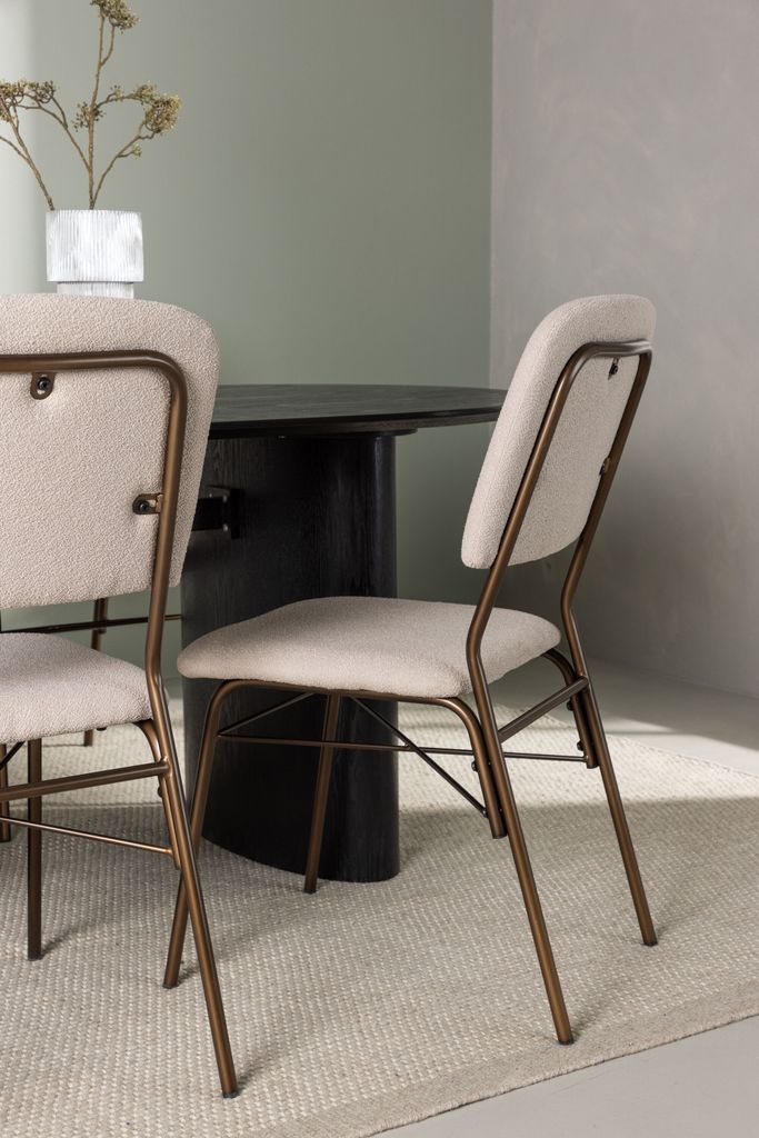 De medföljande beiga stolarna från Seda-serien är klädda i strukturerat polyestertyg som ger en mjuk och inbjudande känsla. Stålbenen i mörkbrunt ger en stilren kontrast och säkerställer stabilitet och hållbarhet. Denna matgrupp kombinerar skönhet och praktikalitet på ett sätt som förhöjer din matplats.