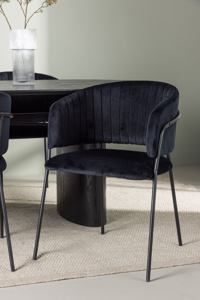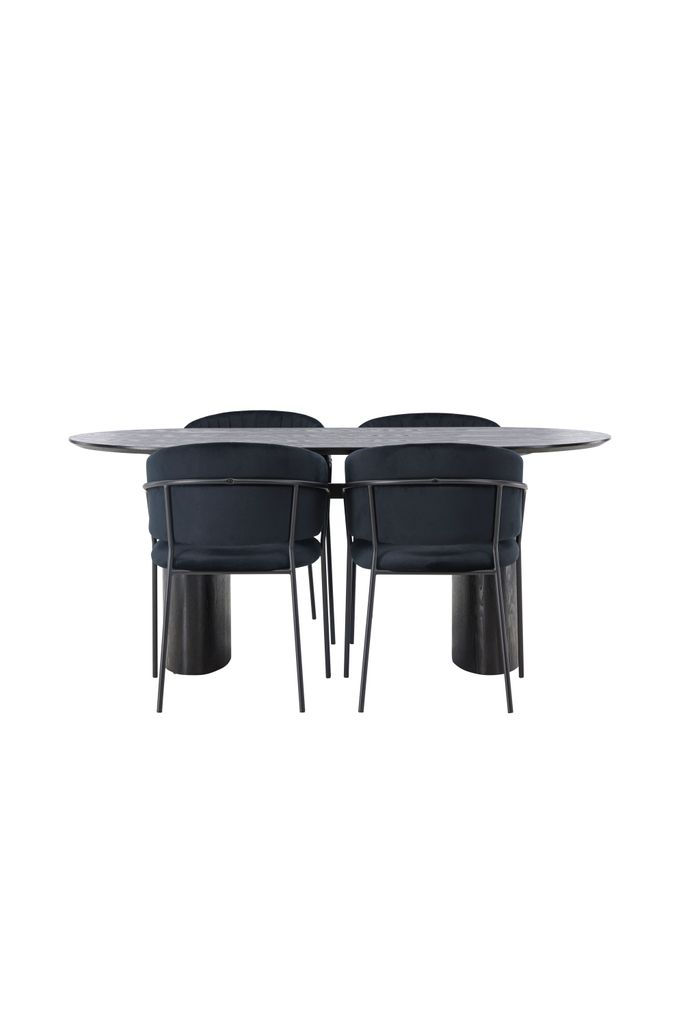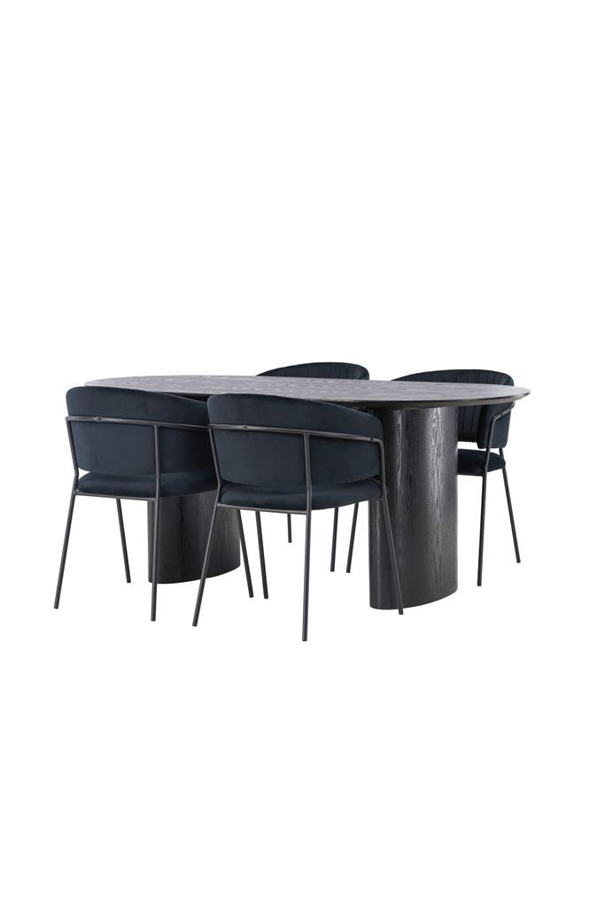 Modern matgrupp med ovalt bord i svart MDF och stilrena Selma-stolar i sammet för elegant komfort.