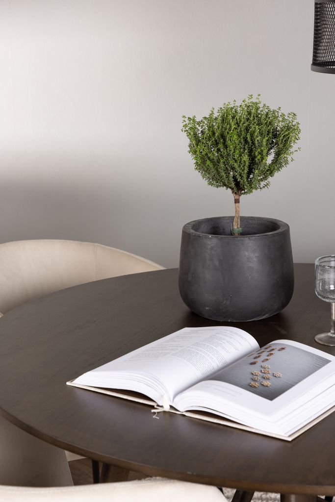 Bordet Kaseidon har en elegant rund bordsskiva tillverkad av MDF i en sofistikerad mörkbrun valnötsfärg. Dess lätt utsvängda ben i gummiträ ger bordet en stabil och robust bas, vilket gör det till ett perfekt val för både middagar och vardaglig användning. Bordets diameter på 100 cm gör det idealiskt för mindre utrymmen utan att kompromissa på stil.