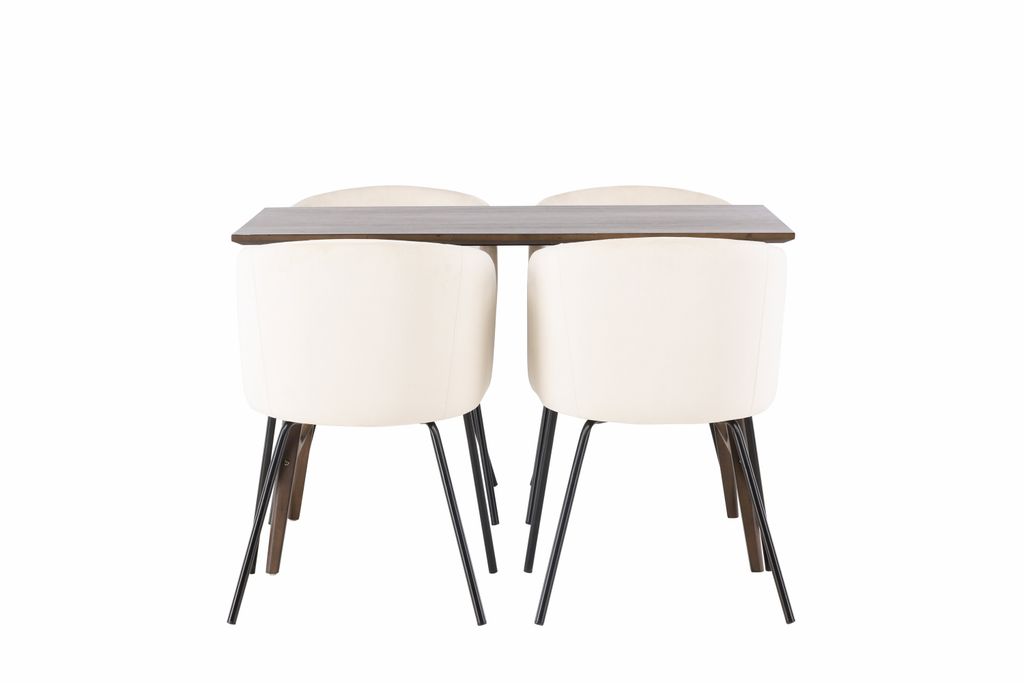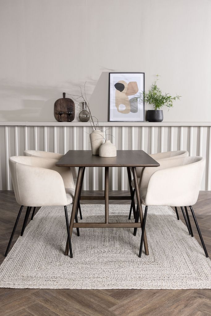 De medföljande Berit-stolarna är helklädda i mjukt sammetstyg och polyesterlinne, vilket garanterar en bekväm sittupplevelse. Stolarna har en lätt rundad rygg för optimal komfort. De smala benen i svart järn bidrar med en modern kontrast till den varma bordstonen.