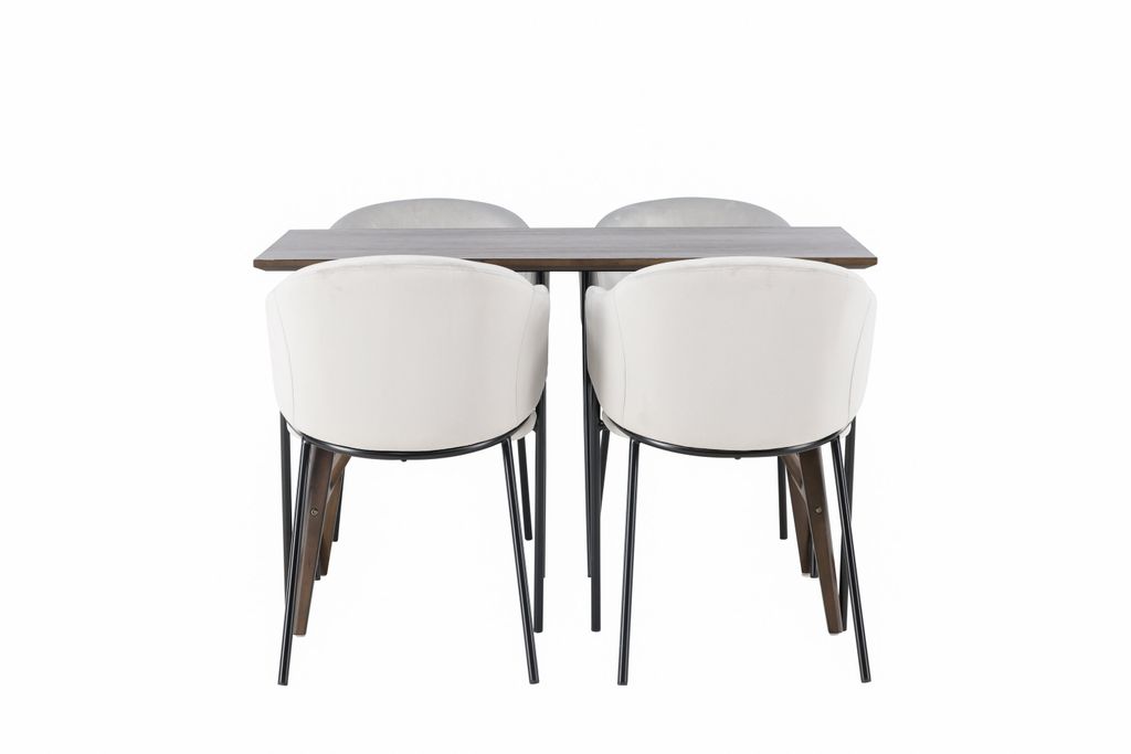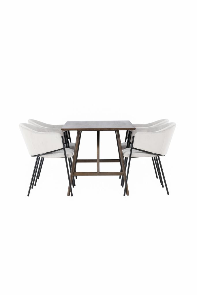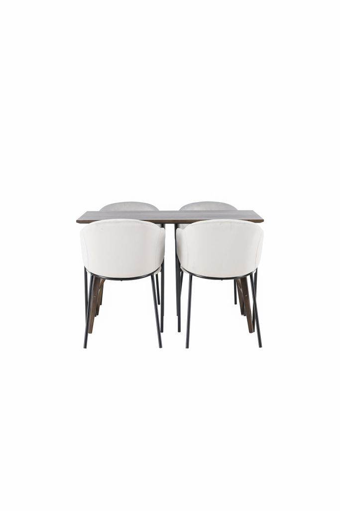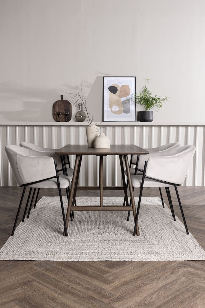 Upplev en kombination av stil och komfort med Venture Home Matgrupp Kaseindon och Evelina-stolarna. Den här matgruppen är designad för att bli mittpunkten i ditt hem. Bordet, med sina mått på 80x120 cm, har en slät yta av valnötsfärgad MDF som ger ett elegant intryck. De lätt utsvängda benen i gummiträ bidrar till en balanserad och modern design.