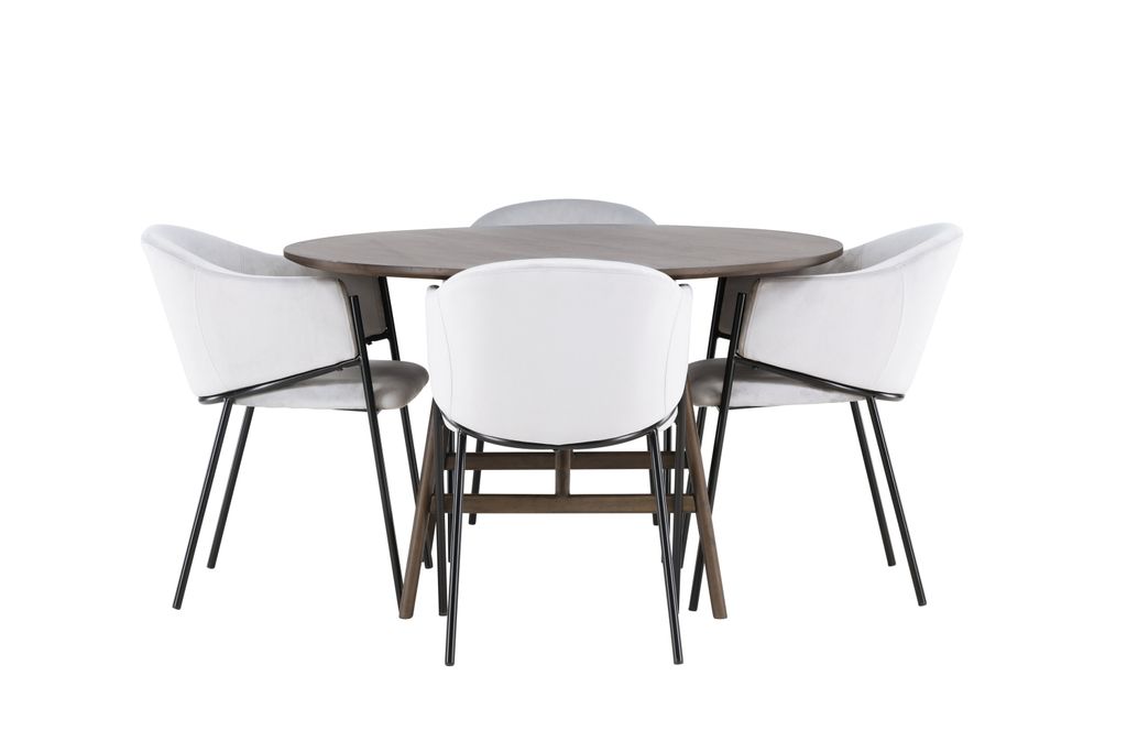 Uppgradera ditt hem med Venture Home Matgrupp Kaseindon med stolarna Evelina, en perfekt blandning av stil och funktionalitet. Det runda bordet är tillverkat av MDF i en vacker valnötsfärg med en matt finish, som skapar en sofistikerad känsla i ditt vardagsrum. Bordets lätt utsvängda ben i gummiträ tillsammans med en stabiliserande stomme ger inte bara stabilitet utan också ett elegant intryck.