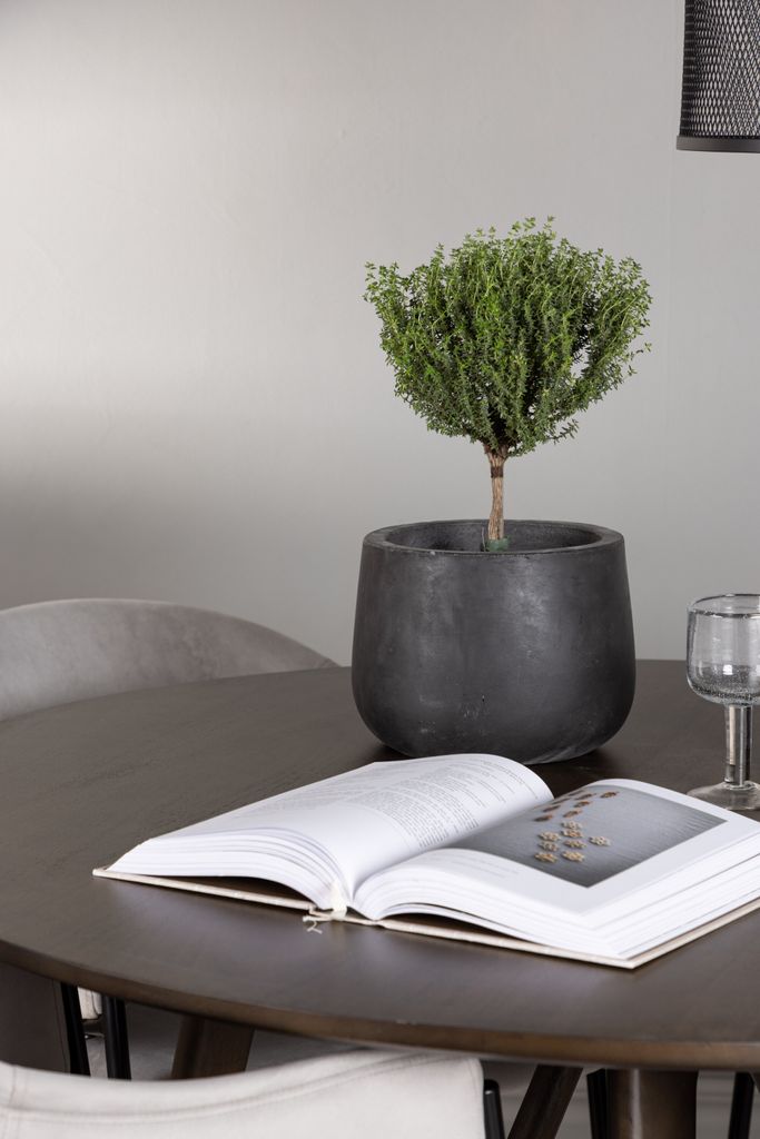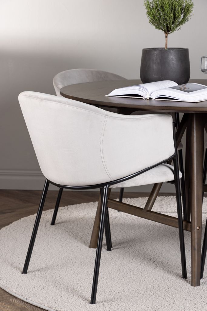 Bordets diameter på 100 cm gör det till en idealisk mittpunkt för familjemiddagar eller sociala sammankomster. Matcha bordet med de stilrena Evelina-stolarna, som erbjuder en fantastisk komfort med sin helklädda sits i mjukt ljusgrått sammetstyg. Det eleganta, rundade ryggstödet och den minimalistiska benstommen i svart stål ger en modern touch och kontrast till bordets rustika känsla.