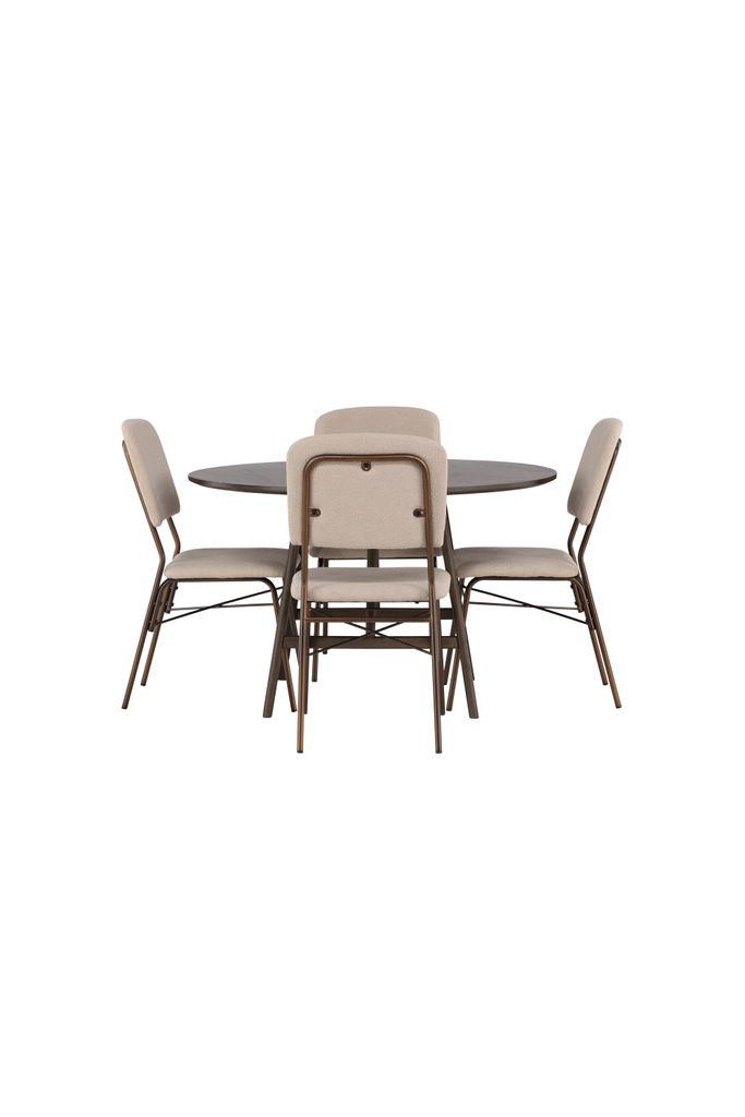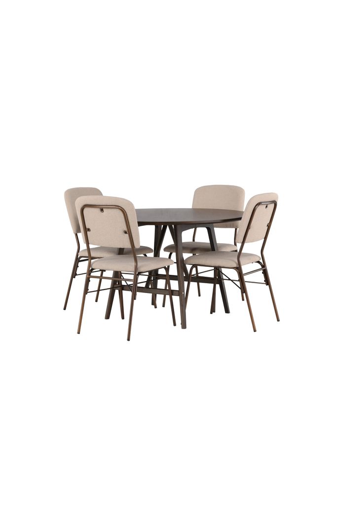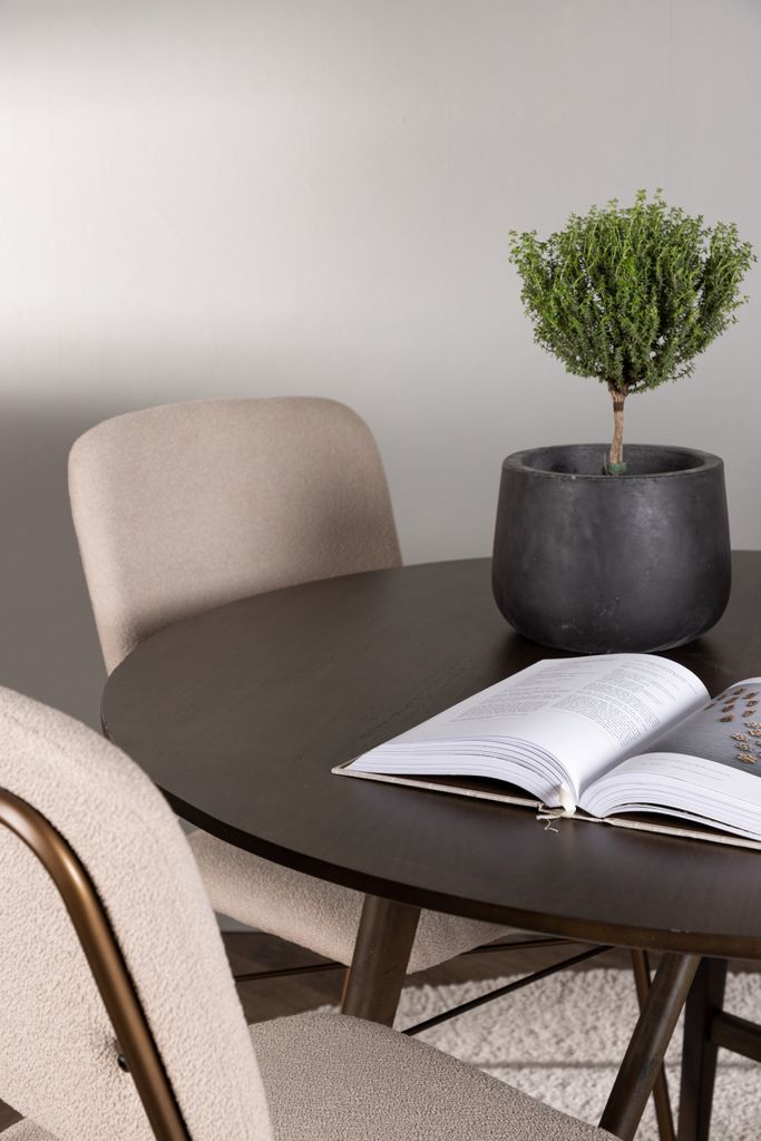 Elegant matgrupp med rund bordsskiva i valnötsbrun och stilfulla, beigea stolar för modern hemtrevnad.