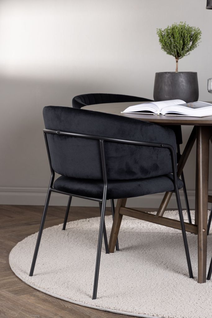 Stolarna Selma kommer i en elegant svart färg med en helklädd design och en bekväm, lätt rundad rygg. Sitsen är täckt i sammetstyg som ger ett lyxigt lyster, medan de smala benen i svart stål ger ett modernt och stilrent intryck. Dekorsömmarna på stolarna adderar extra detaljer och förhöjer känslan av exklusivitet.