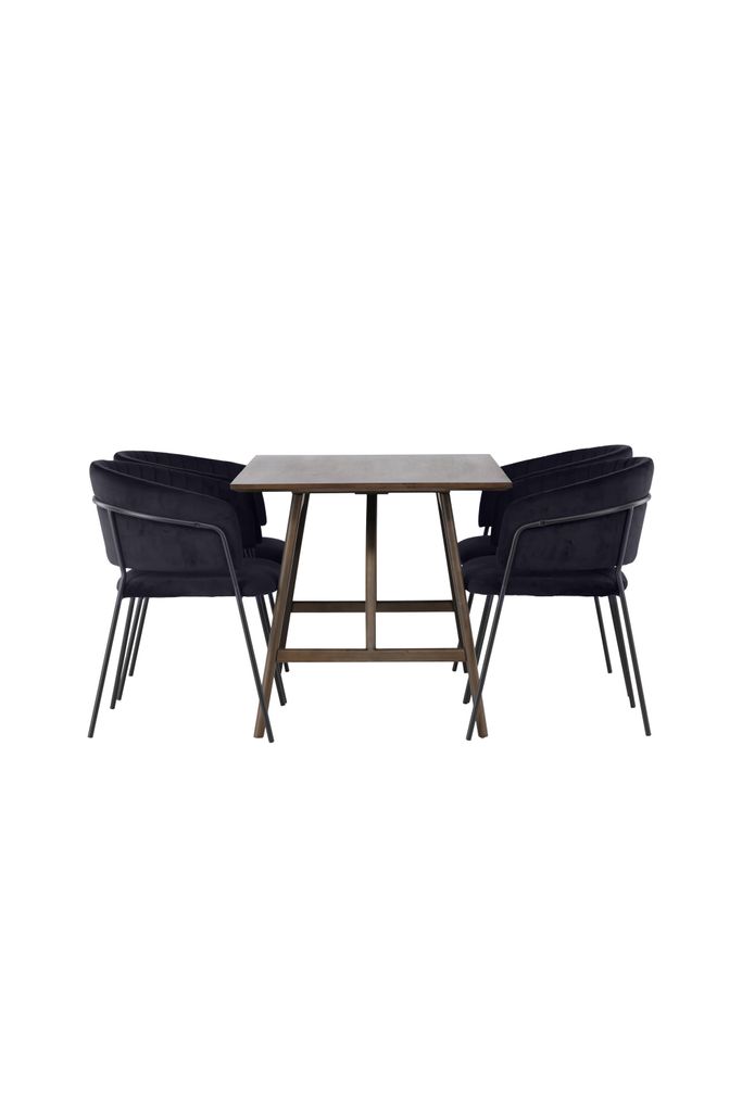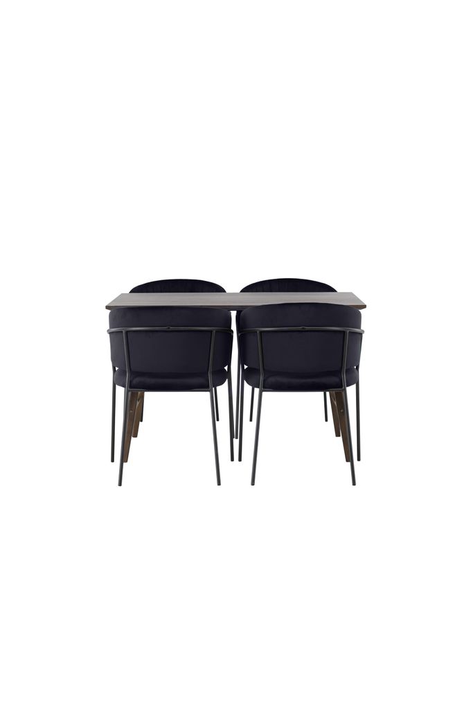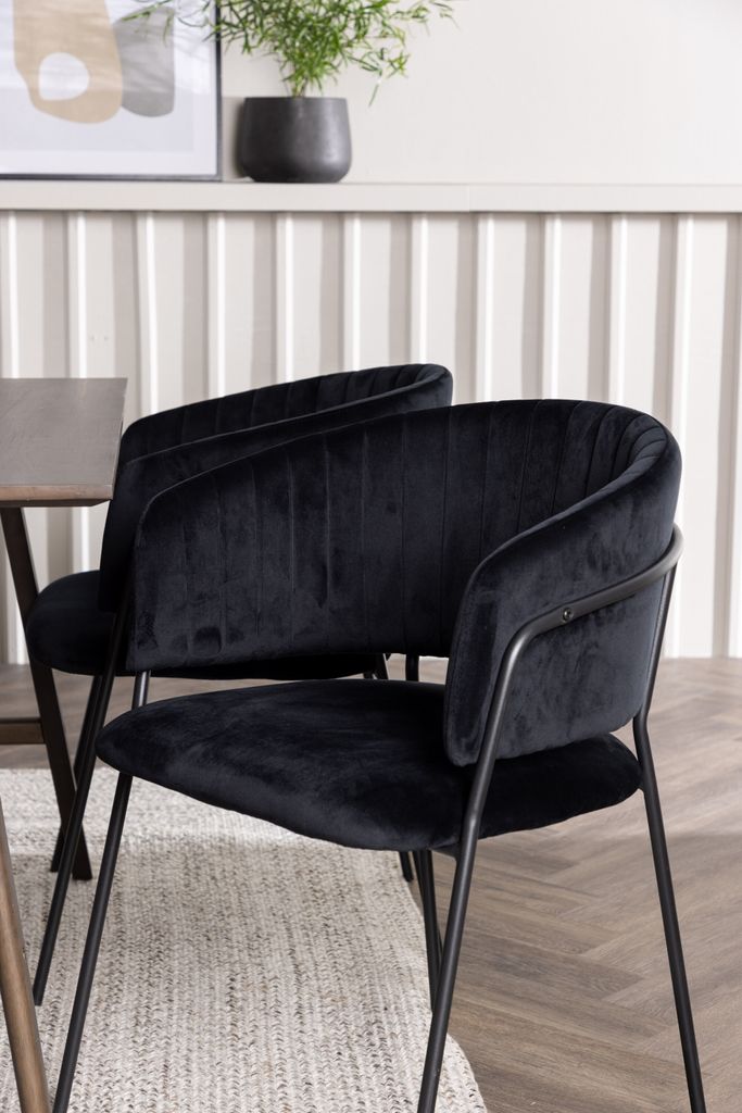 Denna matgrupp inkluderar också fyra stilfulla svarta stolar från serien Selma. Stolarna har en helklädd design med lyxigt sammetstyg, och deras lätt rundade ryggar ger både komfort och elegans. Dekorsömmar och smala svarta stålben skapar en sofistikerad kontrast som lyfter hela rummet.