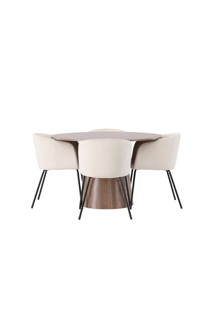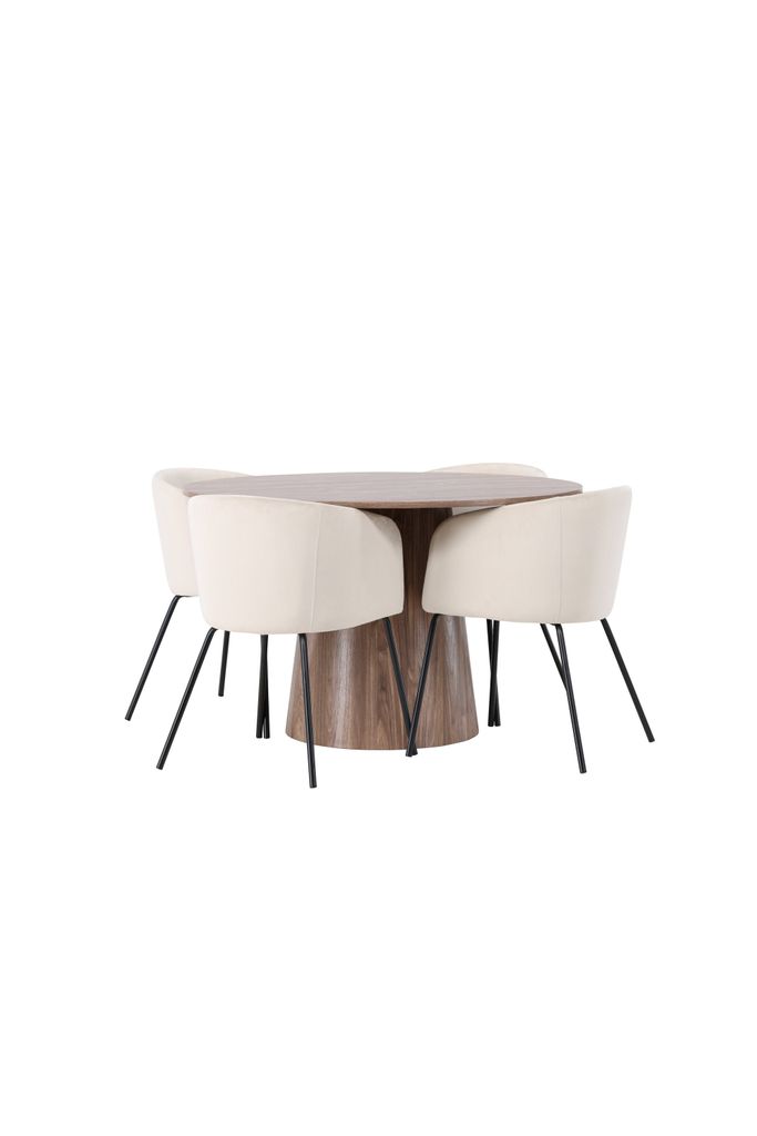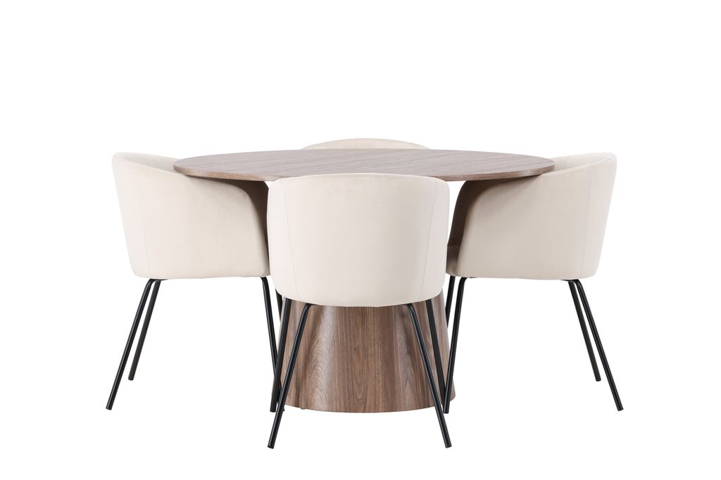 Modern matgrupp med rundat bord i MDF och bekväma, helklädda stolar i beige sammetstyg.