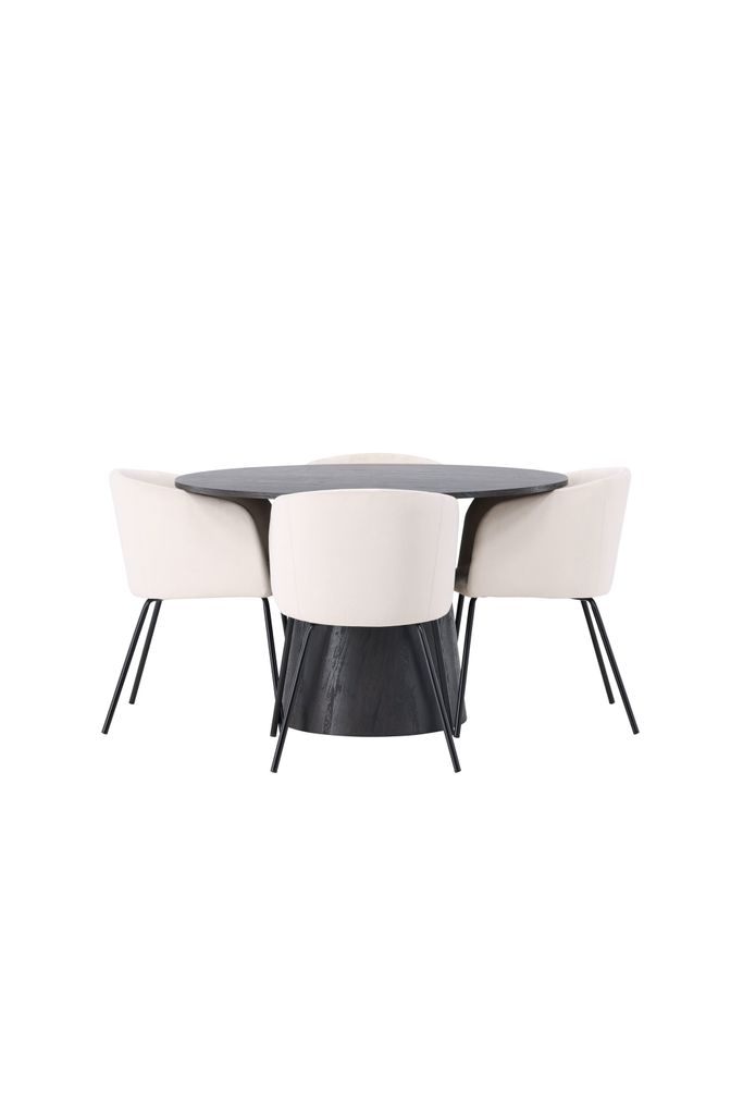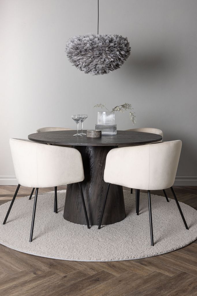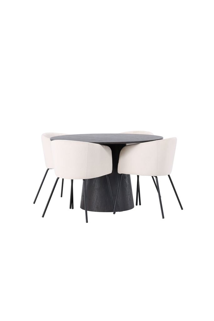 De stiliga Berit stolarna kompletterar bordet med sin helklädda design i beige sammetstyg, vilket ger en mjuk och inbjudande känsla. Stolarnas lätt rundade rygg och sits erbjuder utmärkt komfort, medan de smala benen i svart järn ger en modern och elegant touch. Denna matgrupp är inte bara en plats för måltider, utan ett uttryck av stil och klass.