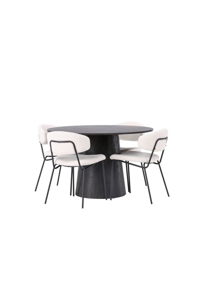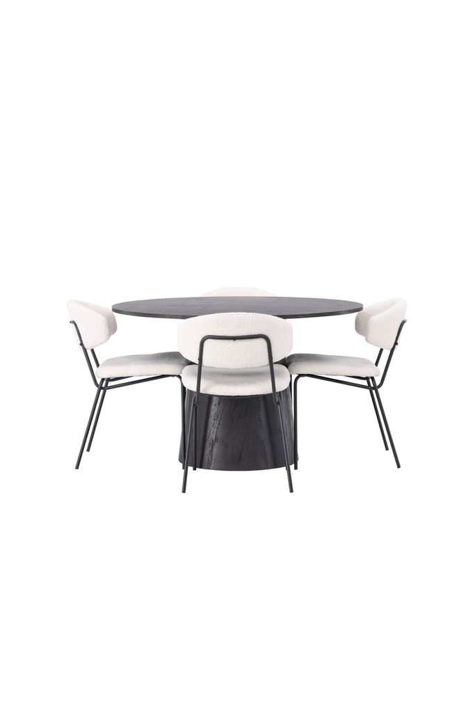 Elegant matgrupp med runt bord i brun MDF och vita stolar i boucletyg. Perfekt för mysiga middagar.