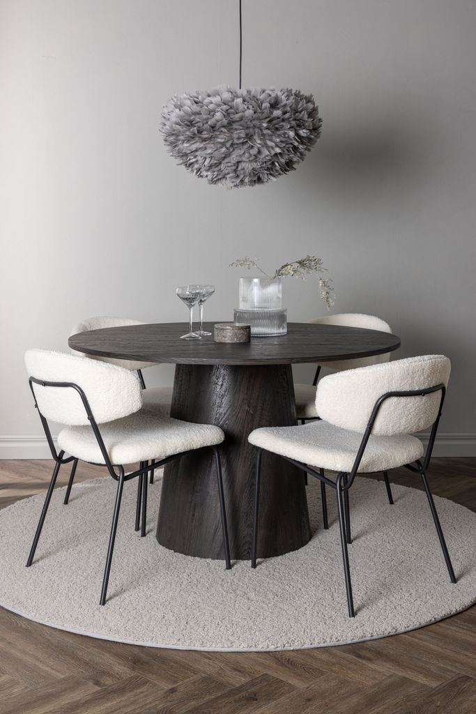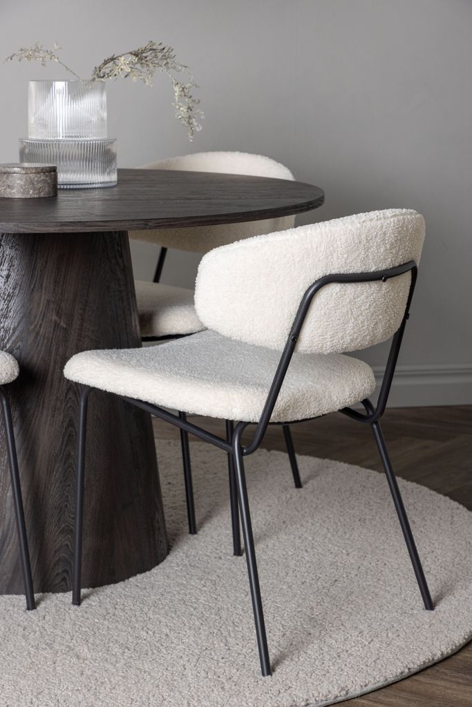 De medföljande Chico-stolarna är klädda i vitt boucletyg, vilket ger en mjuk och inbjudande känsla. Sitsen och ryggstödet är stoppade för extra komfort, medan de smala benen i svart stål ger en modern och luftig look.