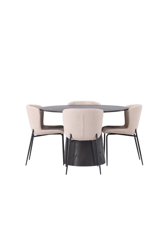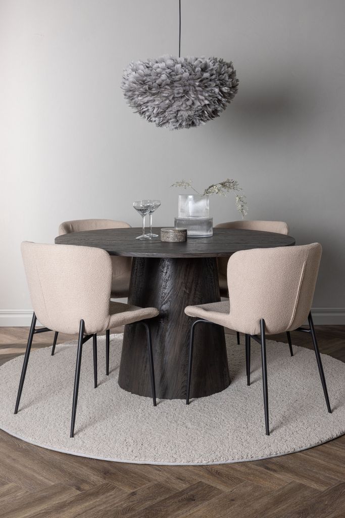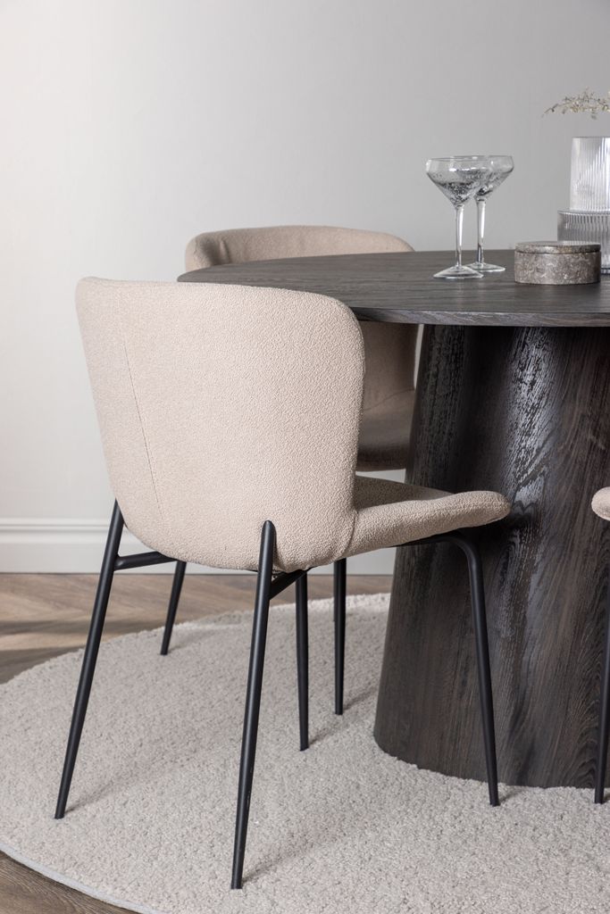 Modesto-stolarna är klädda i mjukt beige lurvigt tyg, och deras smala stolsben i svart metall ger en visuellt tilltalande kontrast. Den lätt rundade ryggen och den stoppade sittdynan säkerställer komfort under långa och trivsamma middagar. Stolarna är designade för att harmonisera med bordet, vilket gör denna matgrupp till ett perfekt val för både stil och funktionalitet.