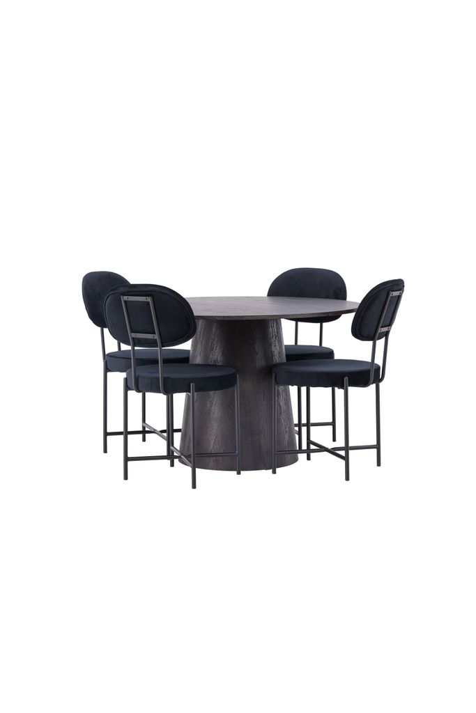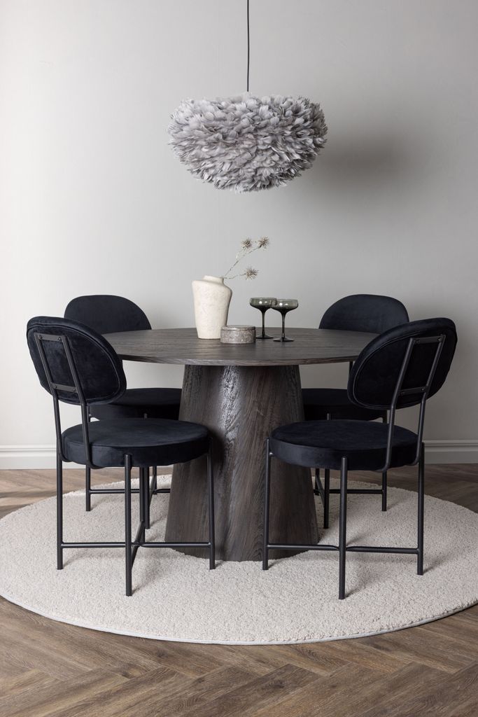 Tillsammans med bordet kommer fyra stolar från Stella-serien, designade med en rund sits och rygg i mjukt svart sammetstyg. De minimalistiska stolsbenen i svart stål ger en elegant kontrast och stabilitet.