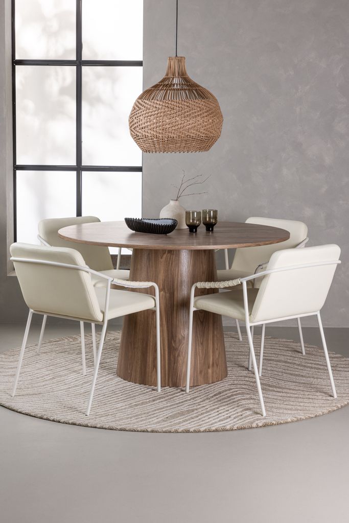 Elegant matgrupp med modernt runt bord i MDF och bekväma stolar i beige polyuretanskinn.