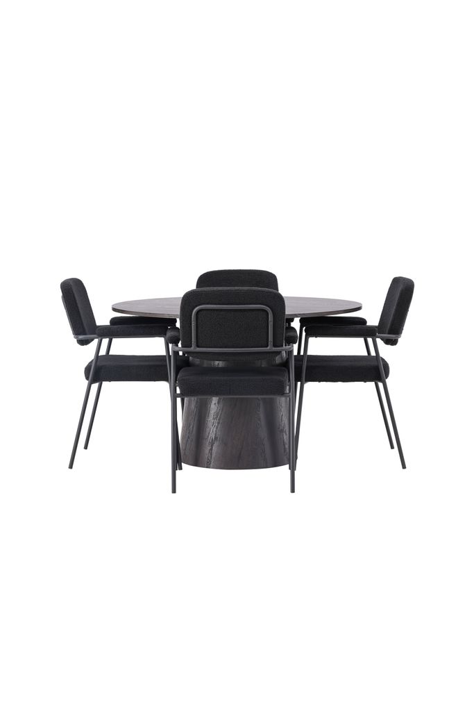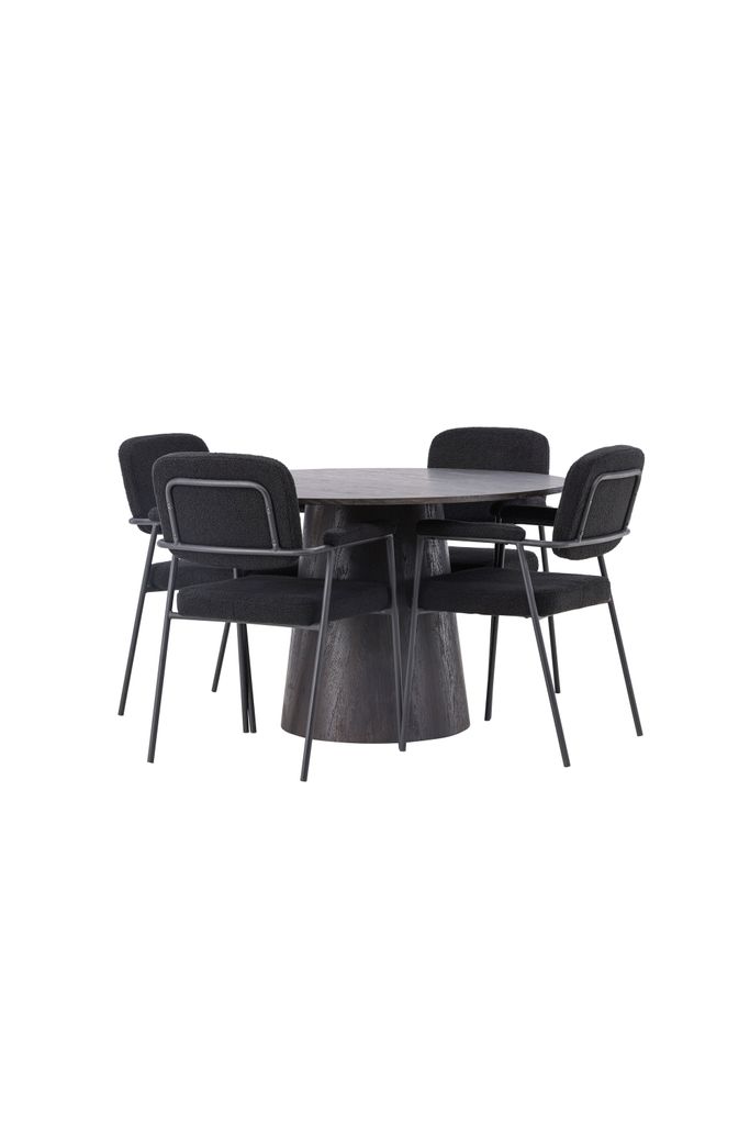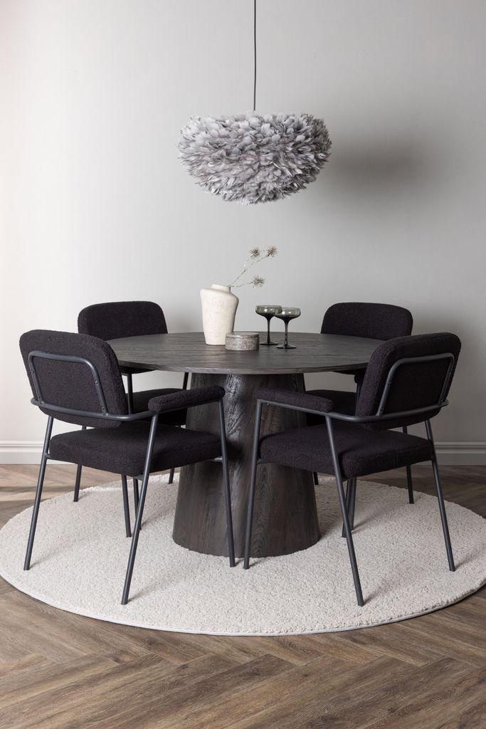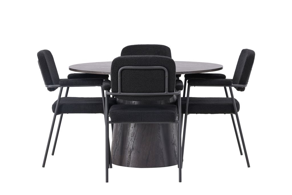 Modern matgrupp med runt bord i brun MDF och svarta boucléklädda stolar. Perfekt för stilfulla vardagsrum.