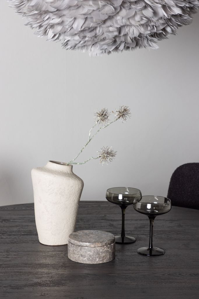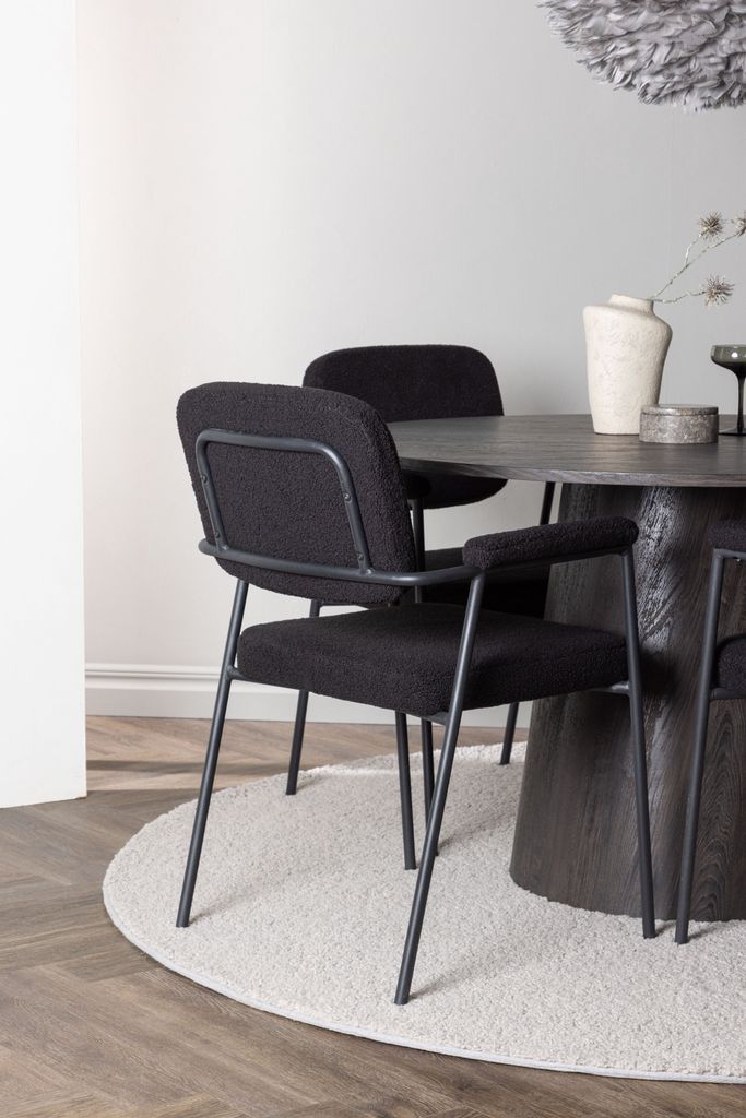 Matgruppen kompletteras med Yesterday-stolar, som har en helklädd sits i svart bouclétyg. De smala stolsbenen i svart metall smälter samman med de integrerade armstöden för att skapa en stilfull och modern siluett. Den mjuka sitsen är noggrant stoppad för att ge extra komfort under långa middagar.