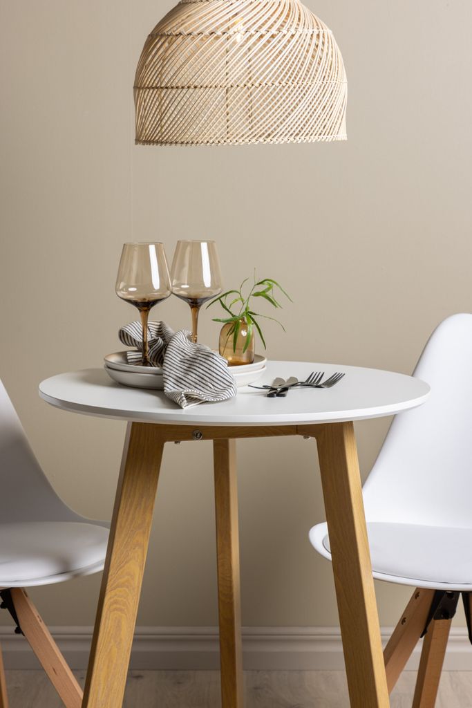 Venture Home Matgrupp Leonora med Stolar Zeno erbjuder ett ljust och stilrent tillskott till ditt hem. Det runda matbordet Leonora har en elegant toppskiva i vit MDF och en stabil trebenig stomme i ek-look som ger både modernitet och stabilitet. Bordets kompakta design med en diameter på 65 cm gör det perfekt för mindre utrymmen.