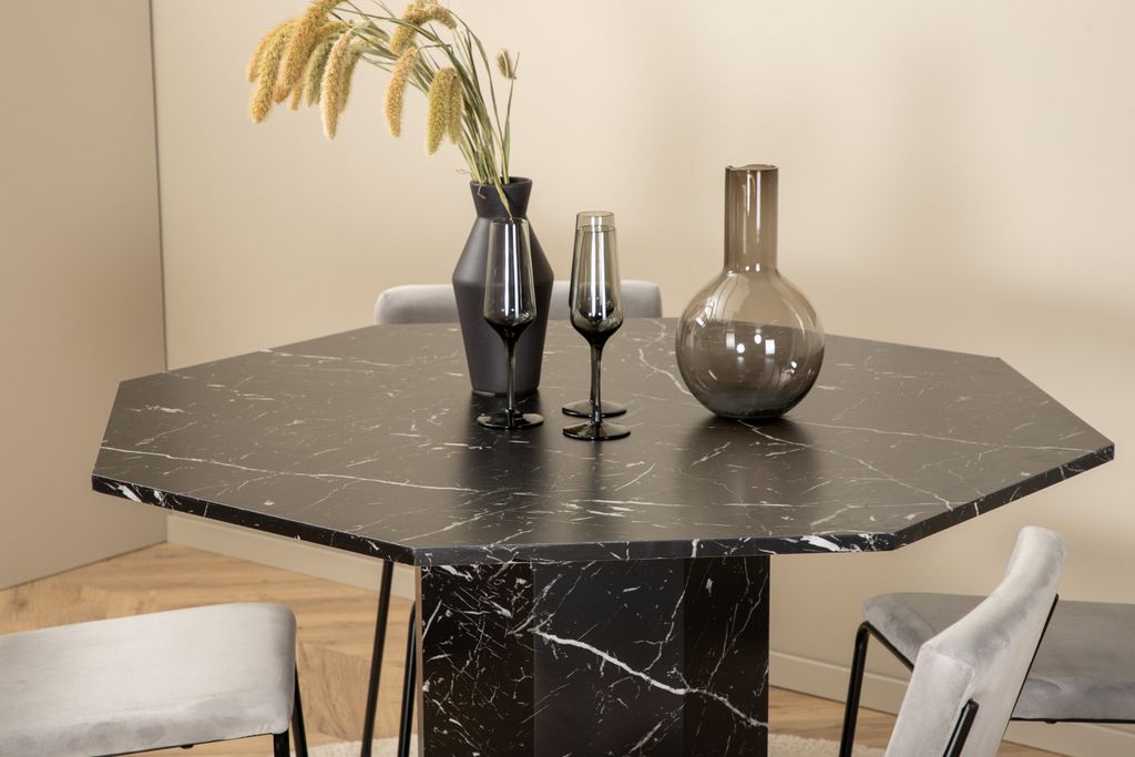 Förvandla ditt matrum med Venture Home Matgrupp Marbs, en inbjudande och stilsäker uppsättning som garanterat blir rummets mittpunkt. Bordet, format som en unik oktagon, har en exklusiv toppskiva i svart marmorglas med ett fascinerande spräckligt vitt mönster. Dess robusta bordsben är tillverkade av MDF och täckta med elegant marmorpapper, vilket ger ett lyxigt men samtidigt modernt intryck.