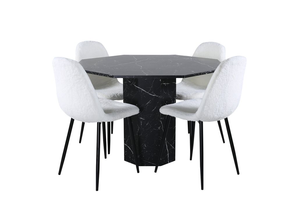 De fyra Polar matstolarna är designade med bekvämlighet i åtanke och har en sittdel i mjukt vitt teddytyg. Stolsbenen är lätt utsvängda och gjorda av svart metall, vilket skapar en modern och trendig look. Denna matgrupp är perfekt för både vardagsmiddagar och festliga tillfällen.