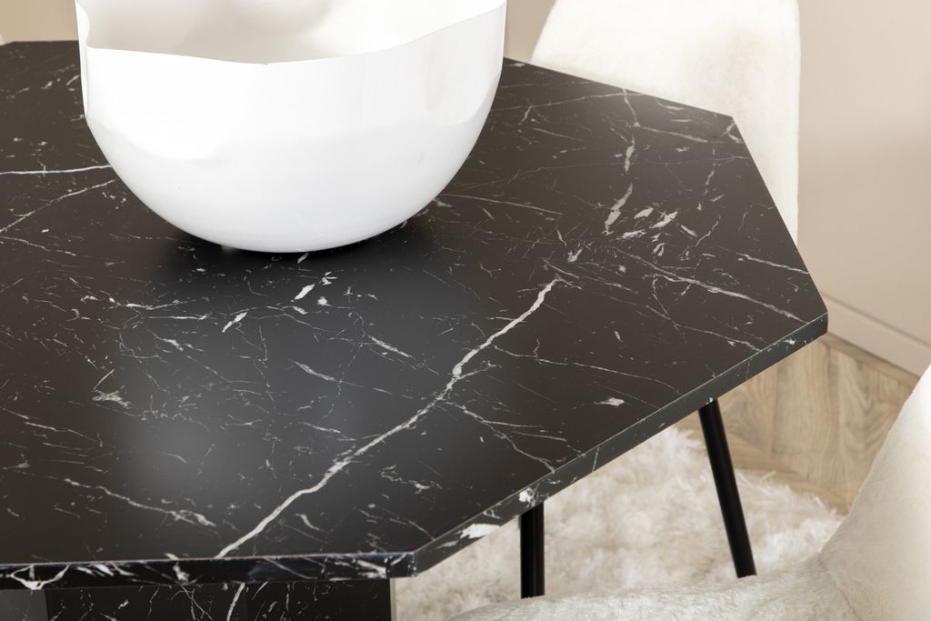 Upplev elegans och komfort med Venture Home Matgrupp Marbs, där klassisk design möter modern funktionalitet. Det oktagonala bordet har en skiva i svart marmorglas med ett spräckligt mönster i vitt, vilket ger en sofistikerad touch till ditt kök eller matsal. Bordets robusta ben är gjorda av MDF täckt med marmorpapper, vilket säkerställer hållbarhet och stil.