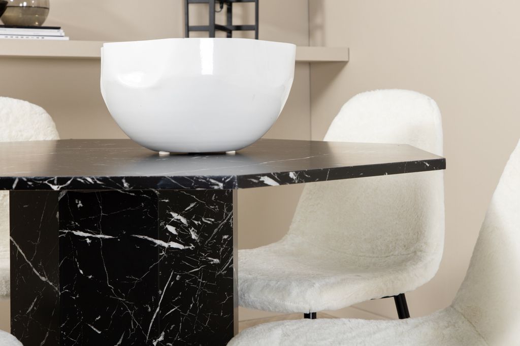 Elegant matgrupp med ett oktagonalt marmorbord och fyra bekväma stolar i vitt teddytyg. Stilfullt och tidlöst.