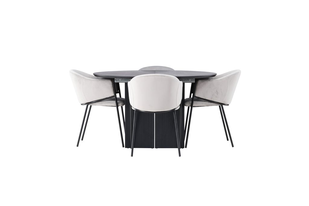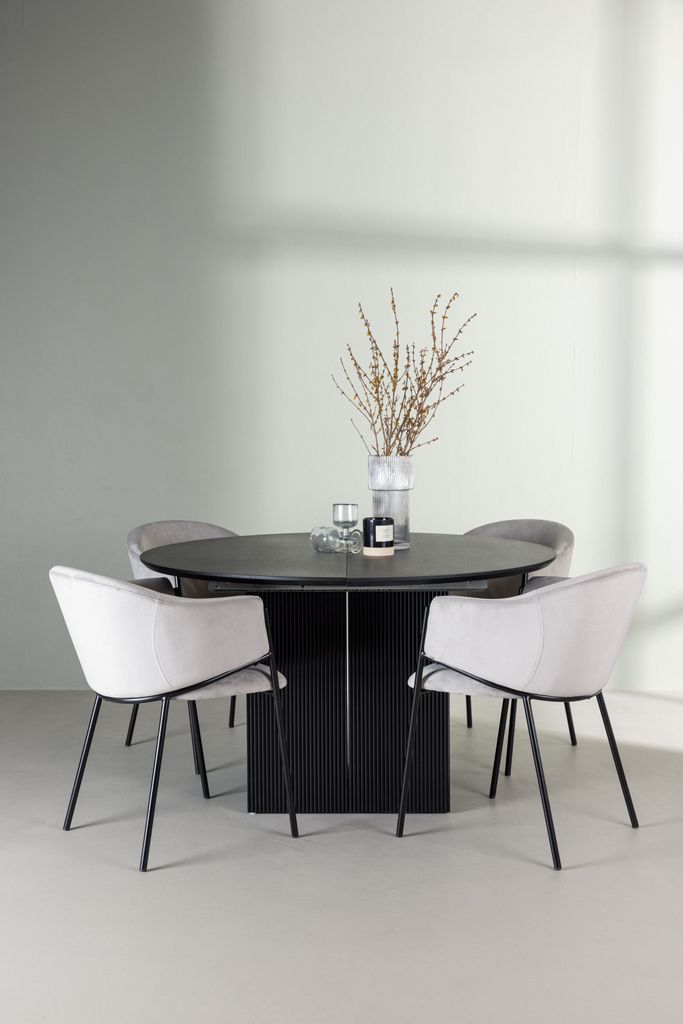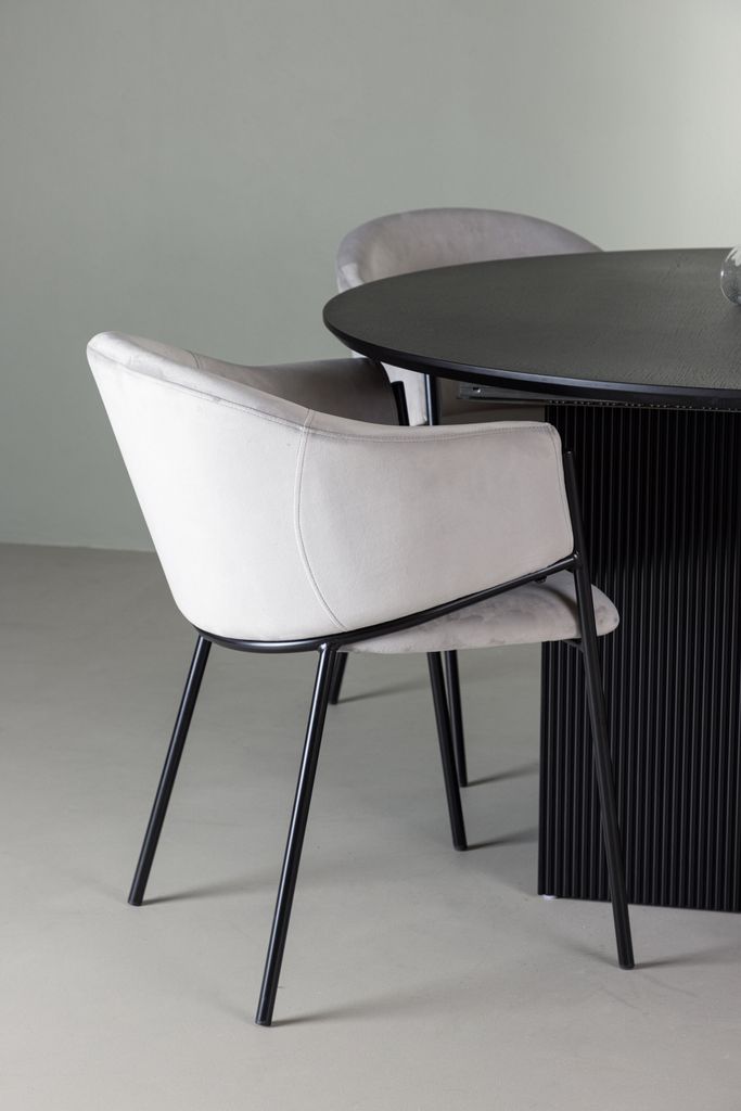 Denna matgrupp inkluderar de stilfulla Evelina stolarna, klädda i lyxig ljusgrå sammet som utstrålar elegans. Stolarna har ett rundat ryggstöd som ger optimalt stöd och komfort för långa middagar. De minimalistiska benen i svart stål kompletterar bordets design och erbjuder hållbarhet och stil.