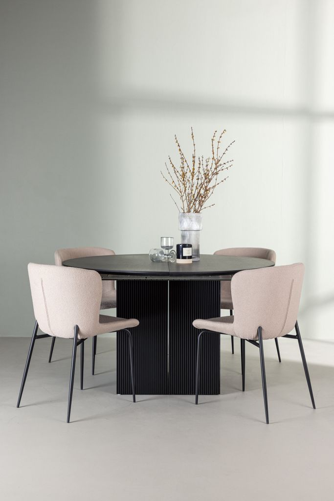 Elegant matgrupp med förlängningsbart bord Matilda och sköna Modesto-stolar i beige bouclé.