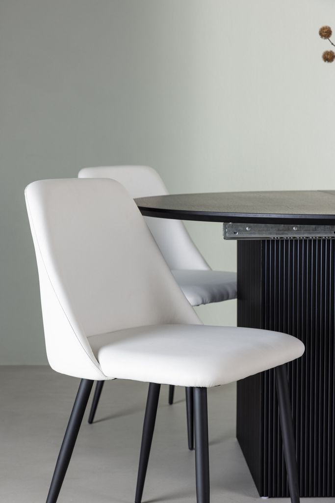 Komplettera ditt matbord med de eleganta Night-stolarna. Dessa stolar har en skandinavisk design med en helklädd sits i vit PU-klädsel, vilket ger en känsla av lyx och elegans. Stolsbenen är tillverkade av svart stål, vilket ger en stabil och modern touch.