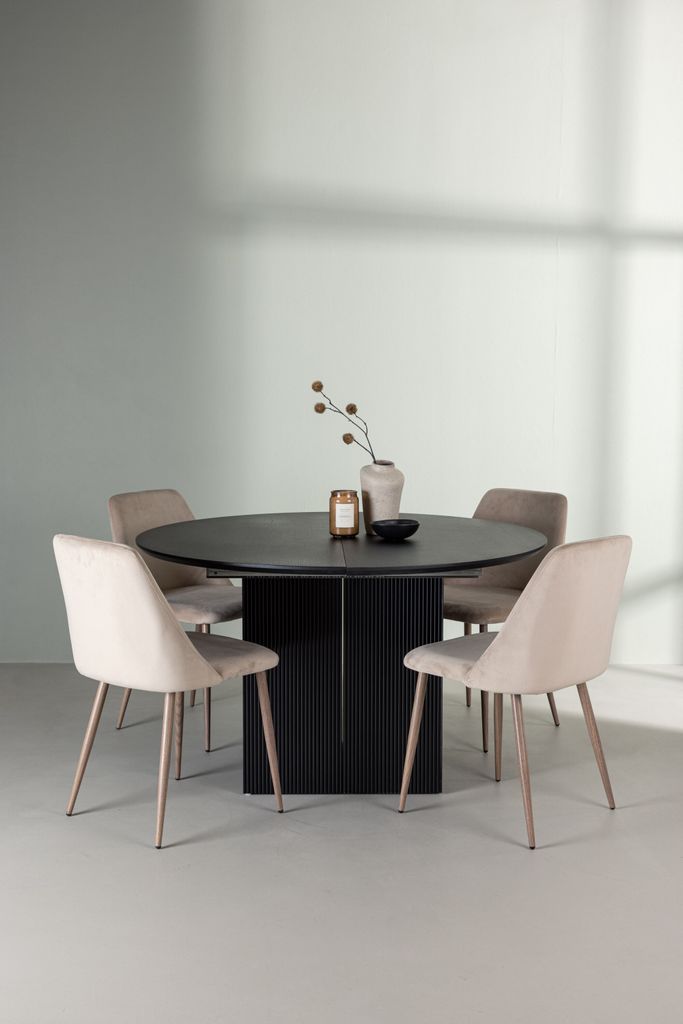 Bordet Matilda har en svart MDF-topp med faner och en robust stomme med klossformade ben, vilket ger en modern och stilfull känsla till ditt hem. Bordets diameter är 130 cm och kan enkelt förlängas till en oval form för att rymma fler gäster.