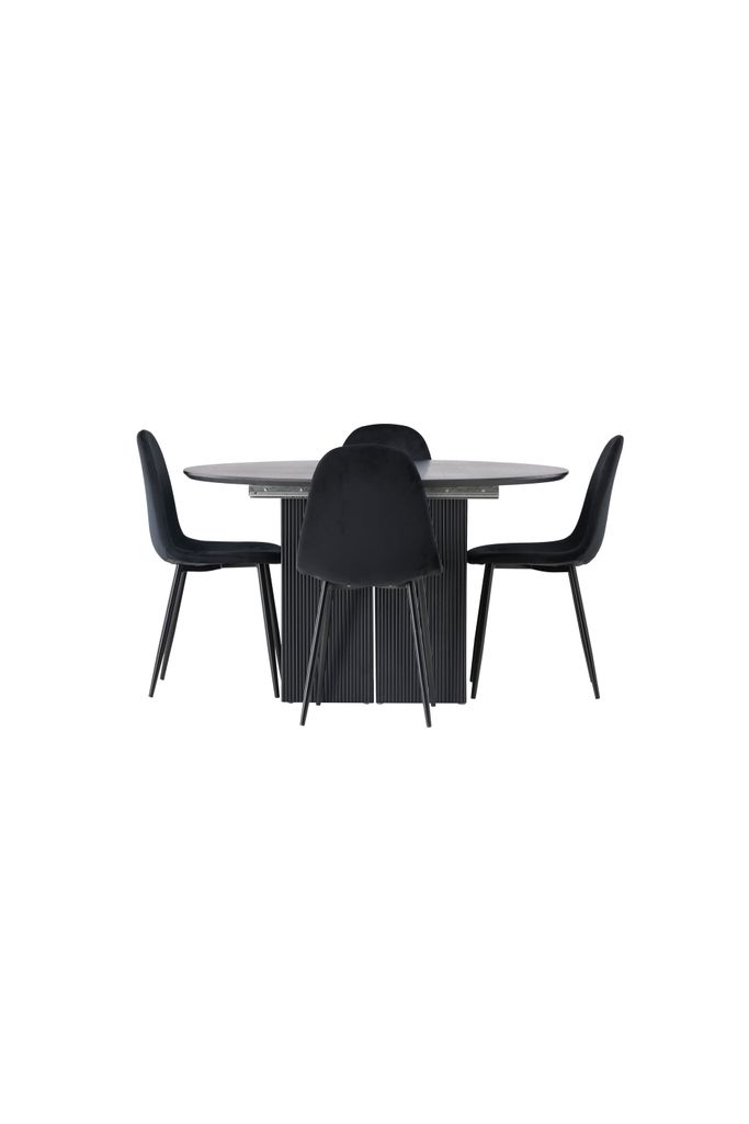 Bordet har en robust stomme med två klossformade ben som ger en stabil grund. Tillsammans med de bekväma Polar-stolarna, klädda i lyxigt svart sammet, skapar denna matgrupp en inbjudande atmosfär. Stolarna har klassiska svarta metallben och en lätt rundad rygg för extra komfort, vilket gör varje måltid till en njutning.