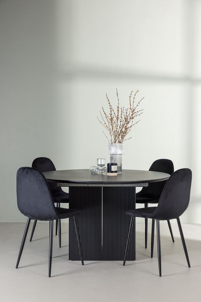 Upptäck den stilrena Venture Home Matgrupp Matilda, perfekt för både vardagsbruk och festliga tillställningar. Det runda bordet har en diameter på 130 cm och är tillverkat av svart MDF med elegant faner, vilket ger en modern touch till ditt hem. Bordet kan enkelt förlängas till ett ovalt bord, vilket gör det idealiskt när du vill välkomna fler gäster.