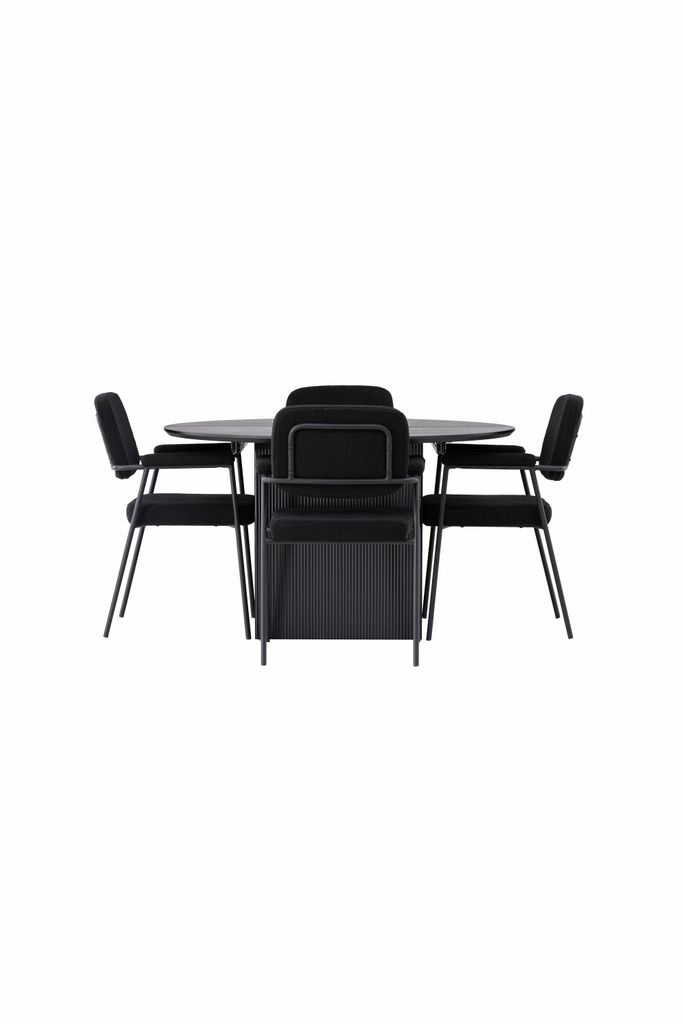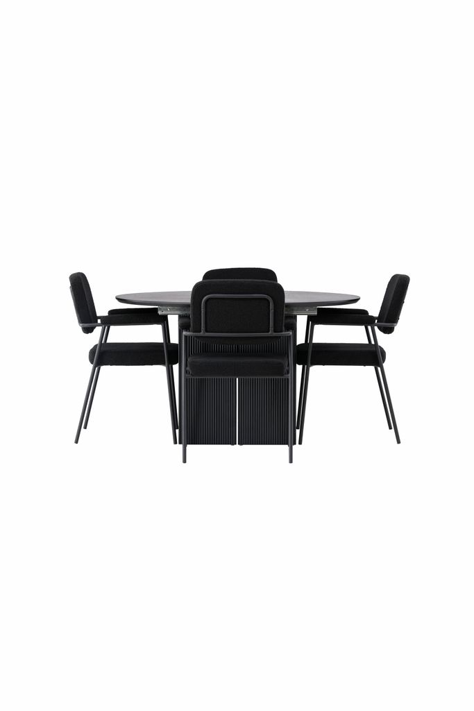 Venture Home Matgrupp Matilda med stolarna Yesterday är en perfekt kombination av tidlös skandinavisk design och smart funktionalitet. Denna eleganta matgrupp består av ett runt matbord med en diameter på 130 cm, tillverkat av svart MDF med faner, och en stadig stomme med klossformade ben som ger en stabil och stilfull bas.