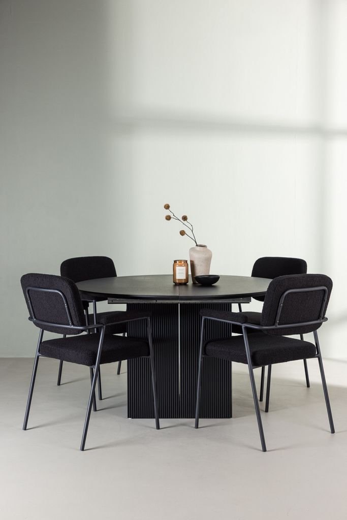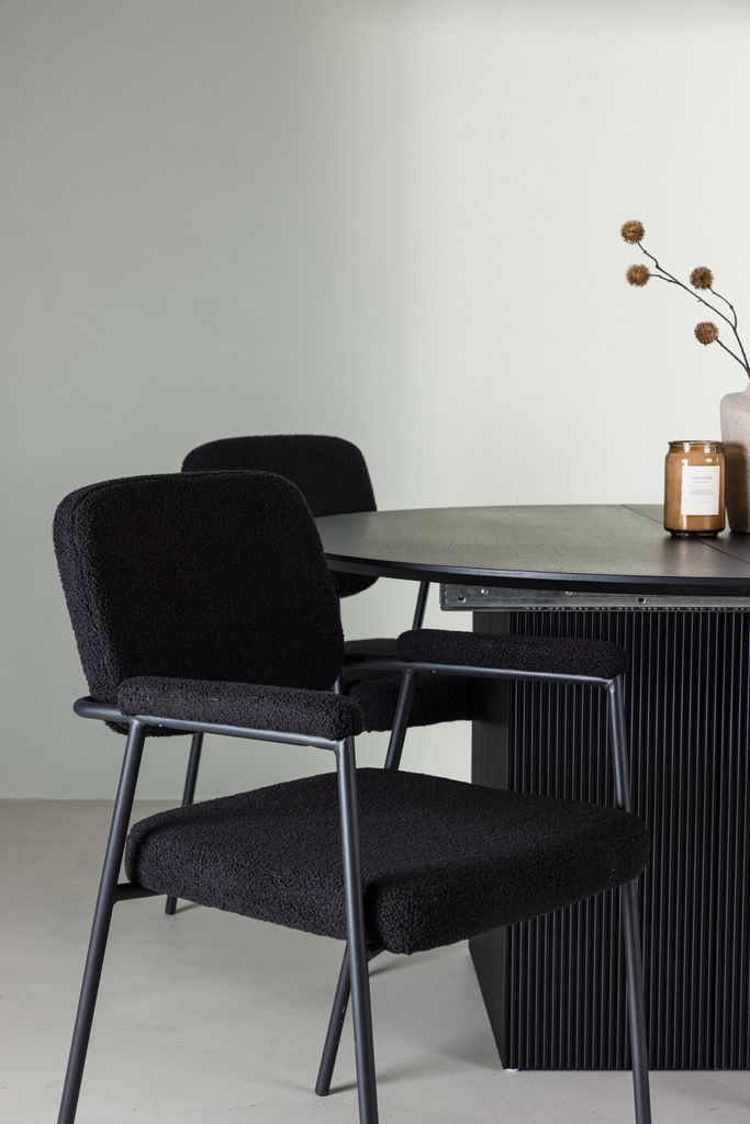 De medföljande stolarna från serien Yesterday har en bekväm helklädd sits i elegant svart bouclétyg. De smala metallbenen och de integrerade armstöden ger både stabilitet och extra komfort, vilket gör dem till en långvarig favorit vid matbordet.