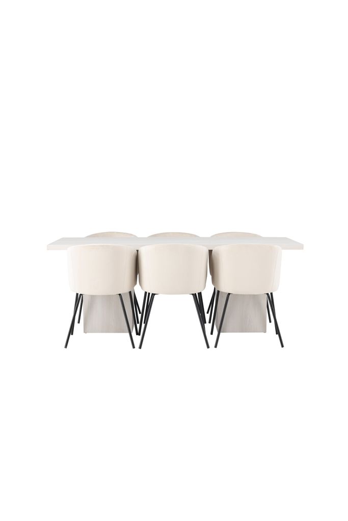 Upptäck Venture Home Matgrupp Olga med Berit-stolar, en perfekt kombination av stil och komfort i skandinavisk design. Detta matbord, med sin vitputsade finish, ger en ljus och fräsch känsla till ditt rum. Bordsskivan i MDF mäter 200x75 cm och vilar på två blockformade ben som ger en stabil och modern look.