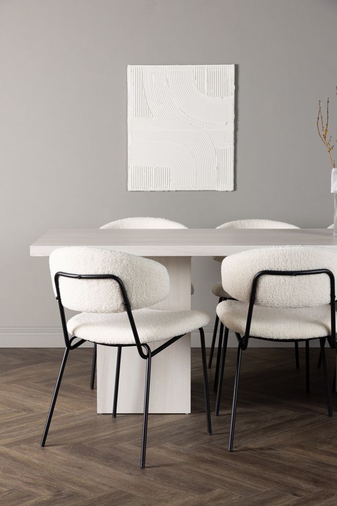 Stolarna Chico erbjuder stilren elegans med sina rundade former och smäckra boucletyg i en elegant beige nyans. Den mjukt stoppade sitsen och ryggstödet garanterar komfort under långa middagar, medan de smala svarta stålkonstruktionerna bidrar till en modern och sofistikerad look.