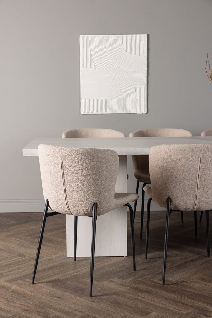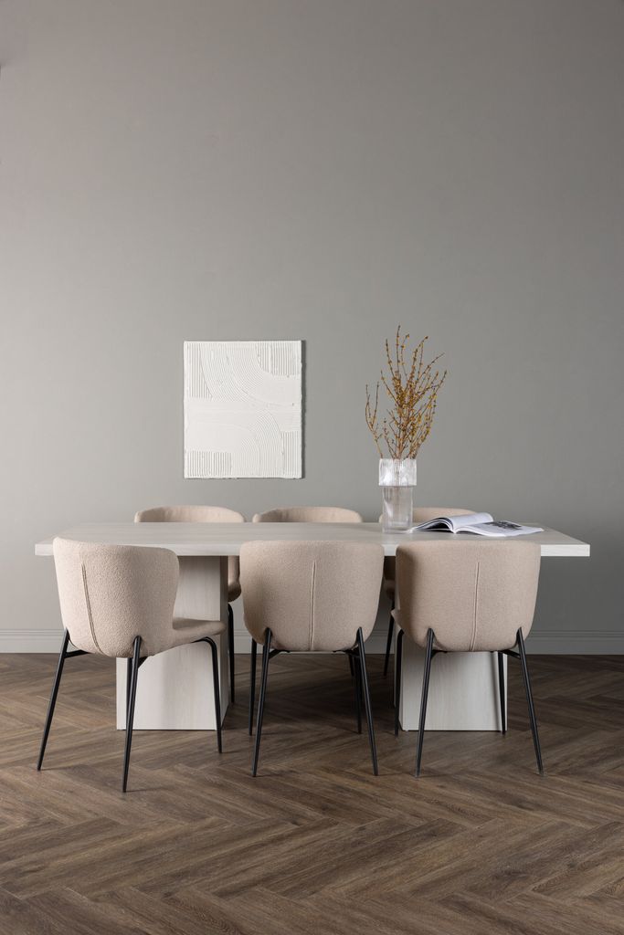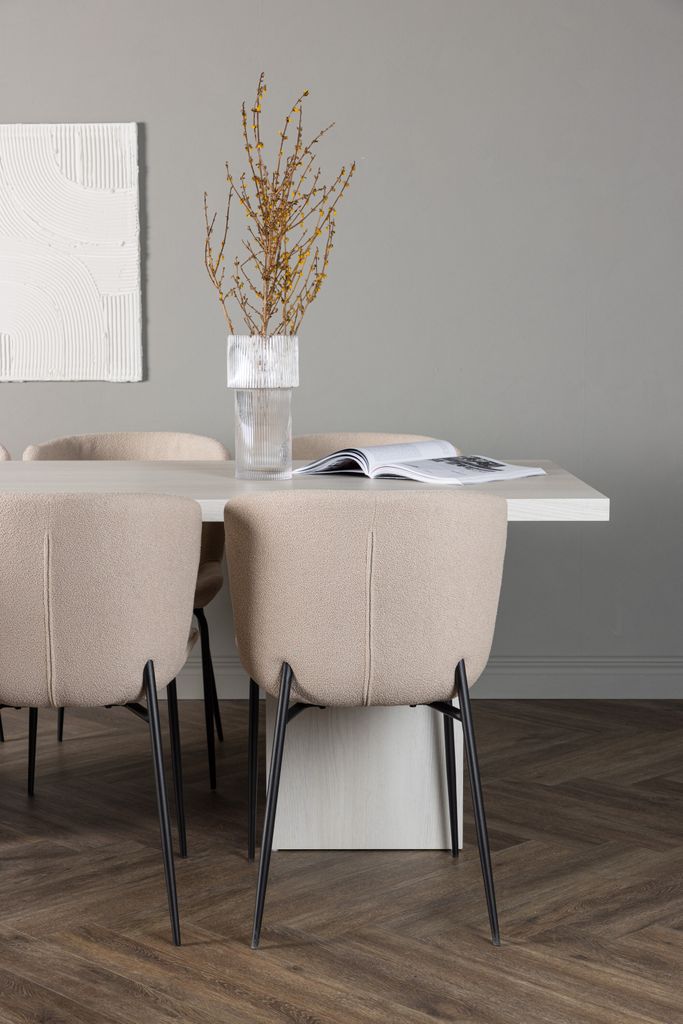 Stolarna Modesto är klädda i lyxigt beige bouclétyg, vilket ger en mjuk och inbjudande känsla. De svarta metallbenen ger en modern kontrast och lyfter fram stolarnas eleganta design. Stolarna erbjuder extra komfort med rundade ryggar och stoppade sittdynor, vilket gör att du kan njuta av långa, avslappnade måltider.