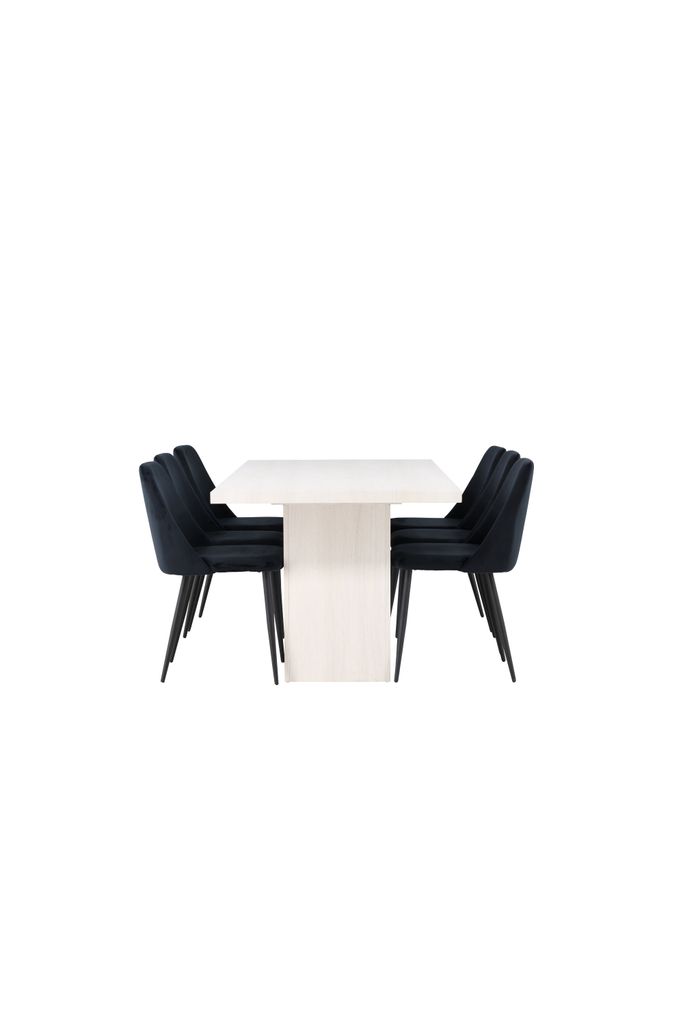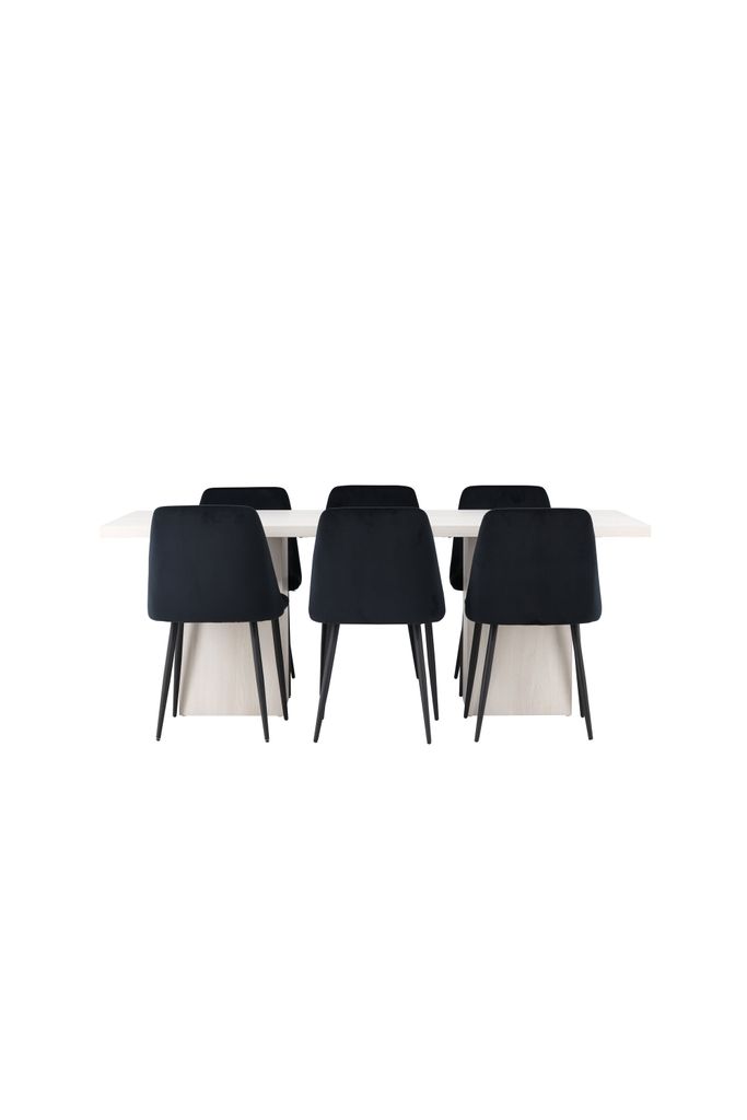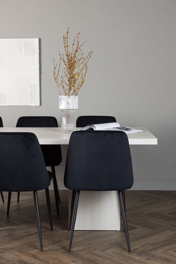 Utforska det perfekta samspelet mellan stil och komfort med Venture Home Matgrupp Olga. Denna matgrupp är designad för att smälta in i moderna hem med sitt vitputsade matbord och eleganta sammetsstolar.