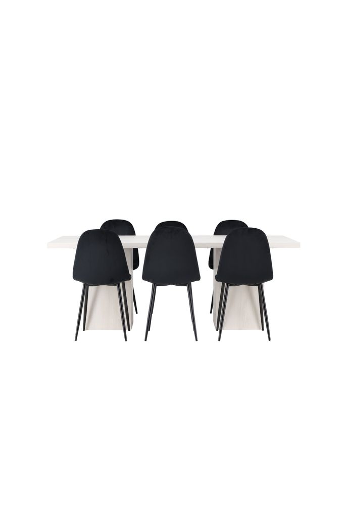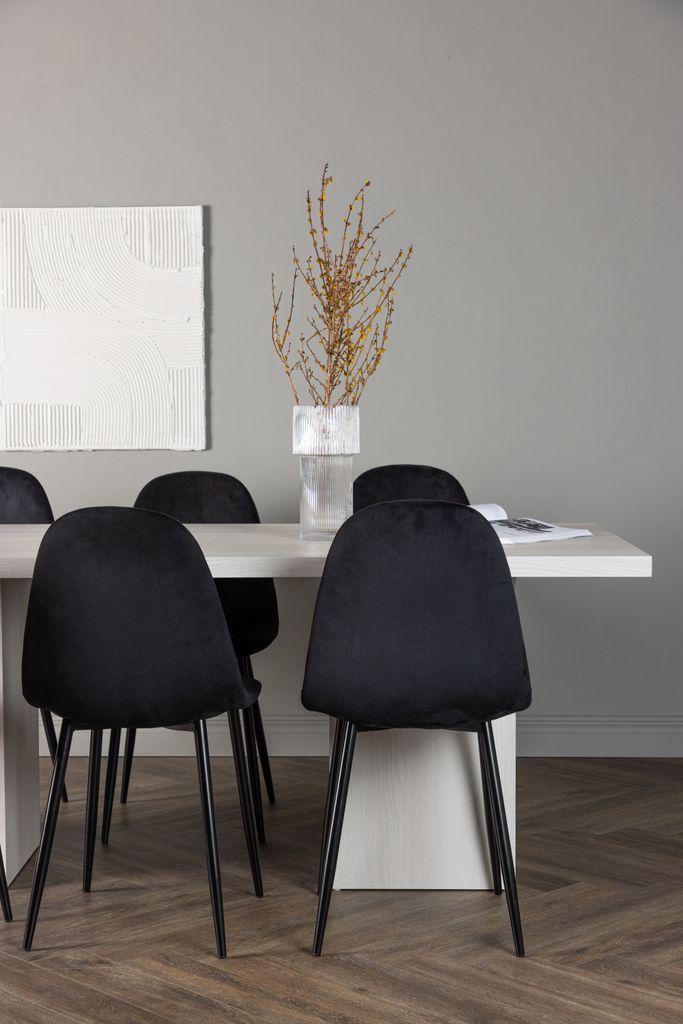 Venture Home Matgrupp Olga med stolarna Polar erbjuder en perfekt kombination av skandinavisk elegans och modern komfort. Det vitputsade bordet i serien Olga har en rektangulär bordsskiva av slitstark MDF, vilket ger en stilren och robust känsla till ditt hem. Med måtten 200x75 cm är det idealiskt för både stora middagsbjudningar och vardagliga måltider.