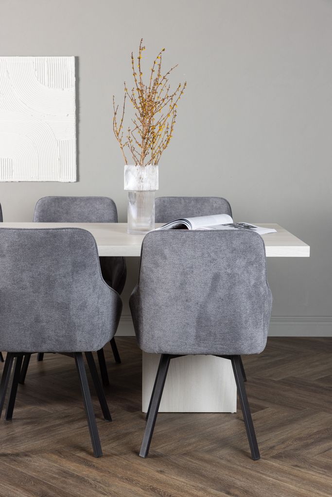 De grå matstolarna Rosie kompletterar bordet med sin skandinaviska design. De är klädda i ett mjukt grått tyg som matchar de flesta inredningar. Stolarna har integrerade armstöd och lätt utsvängda ben i svart metall, vilket ger ett luftigt och modernt intryck. Den stoppade sitsen säkerställer enastående komfort under långa middagar.