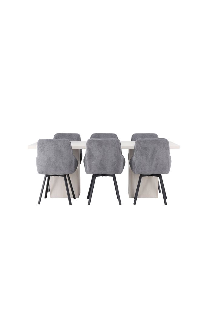 Venture Home Matgrupp Olga med stolarna Rosie erbjuder en tidlös elegans och rustik charm för ditt hem. Bordet Olga är tillverkat av vitputsad MDF, vilket ger en slät och ren yta. Dess robusta blockformade ben ger bordet stabilitet och hållbarhet, perfekt för både vardagsmåltider och festliga tillfällen. Bordets generösa mått på 200x75 cm gör det idealiskt för större sällskap.