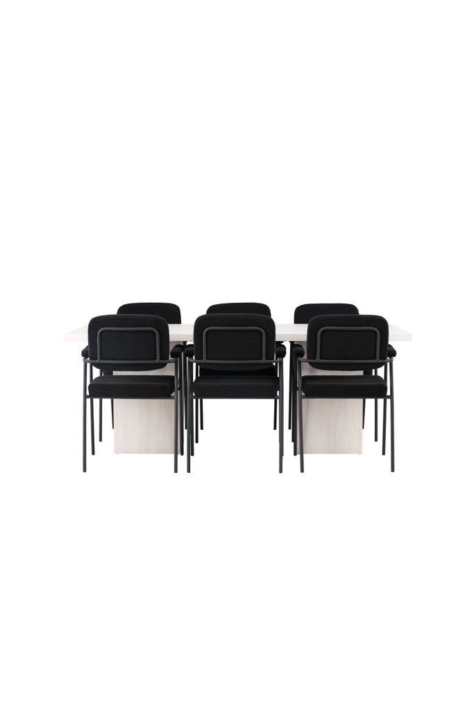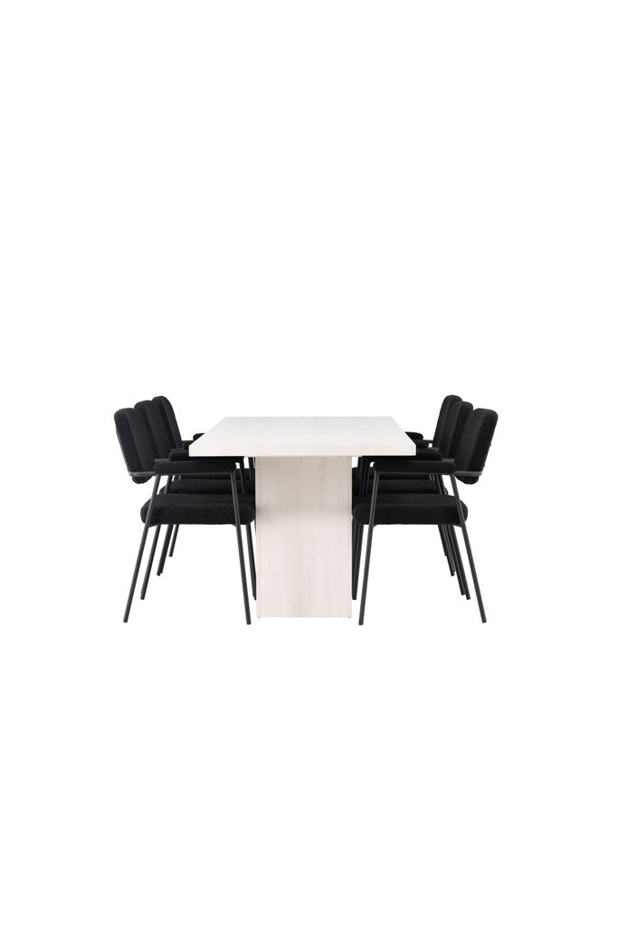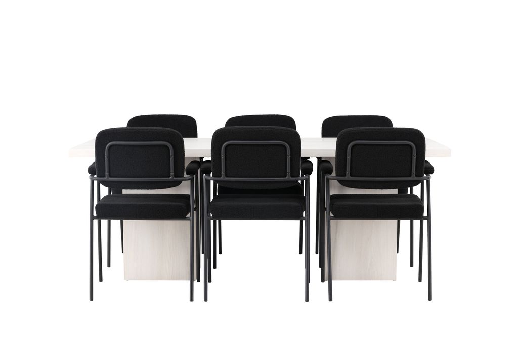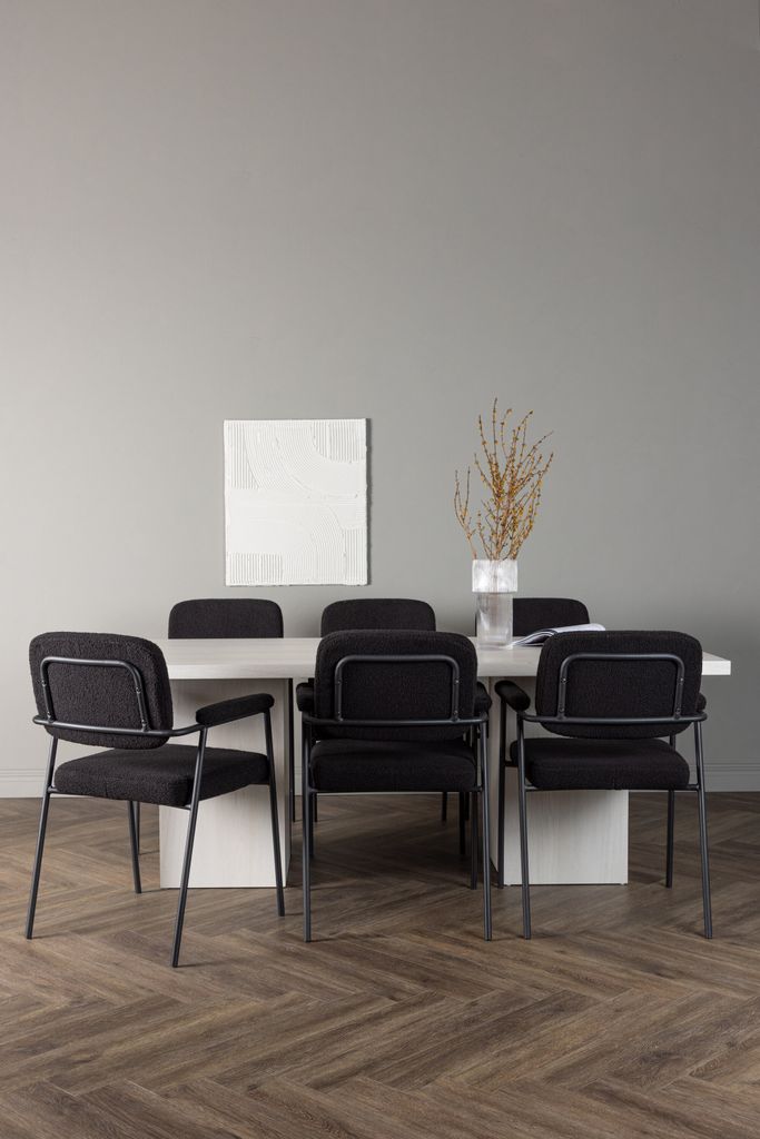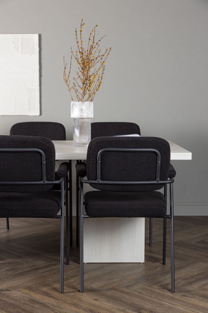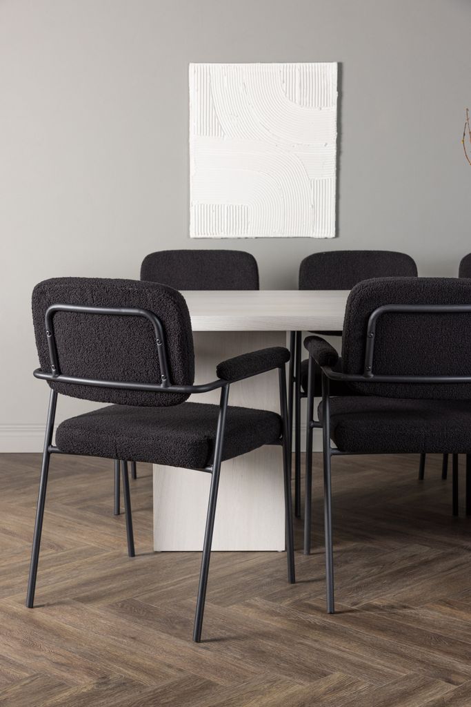 Stolarna Yesterday är klädda i ett mjukt, svart bouclétyg som ger en sofistikerad touch. De smala stolsbenen i svart metall och de integrerade armstöden ger både modern stil och komfort. Stolarna bidrar till en harmonisk och inbjudande atmosfär runt bordet.