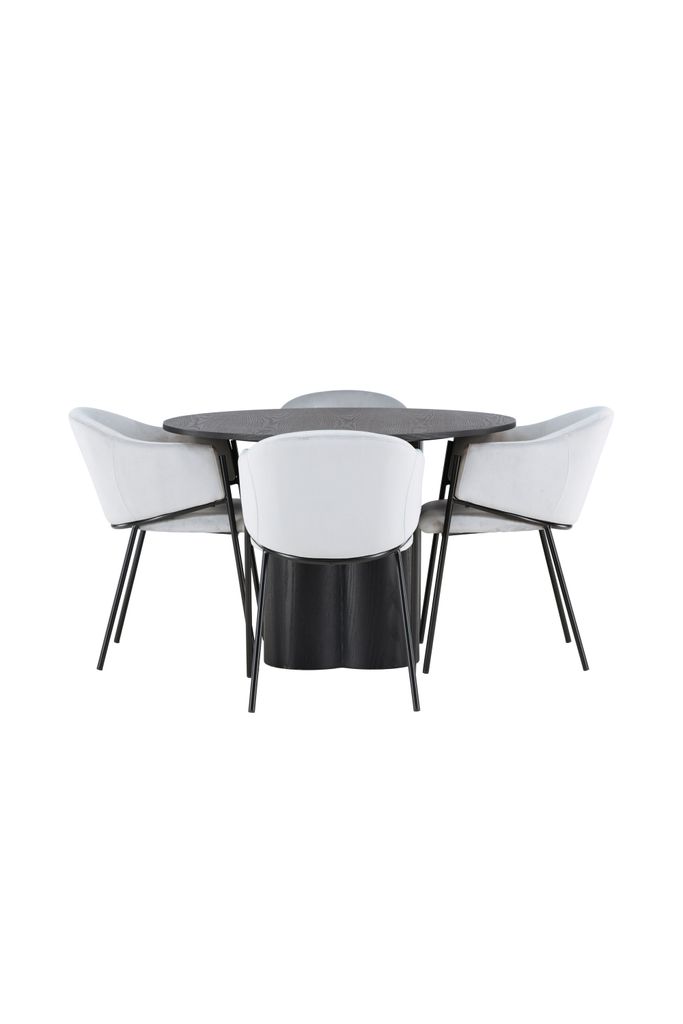 Här i snygg kombination med gråa matstolar från Evelina-serien. Stolen har en modern och stilren design som inte bara ser fantastisk ut utan också är otroligt bekväm. Den helklädda sitsen erbjuder en hög grad av komfort, medan det rundade ryggstödet i ljusgrått sammetstyg ger en extra touch av elegans. Den minimalistiska benstommen i svart stål ger också bra stabilitet till helhetsintrycket!