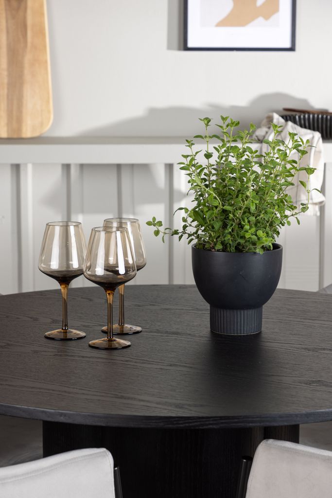 Vårt runda matbord Olivia imponerar med sin tidlösa design och unika form. Den tunna toppskivan ger en modern och sofistikerad känsla och de cylinderformade benen ger en stabil bas. Bordet är tillverkat i svart MDF med faner, vilket ger en subtilt täckande yta och framhäver materialets naturliga mönster. Bordets mått: 110cm.